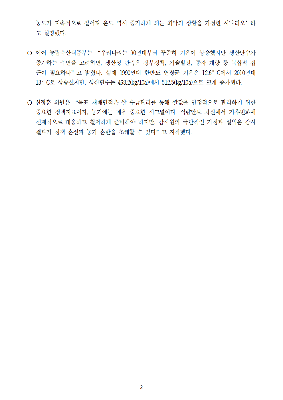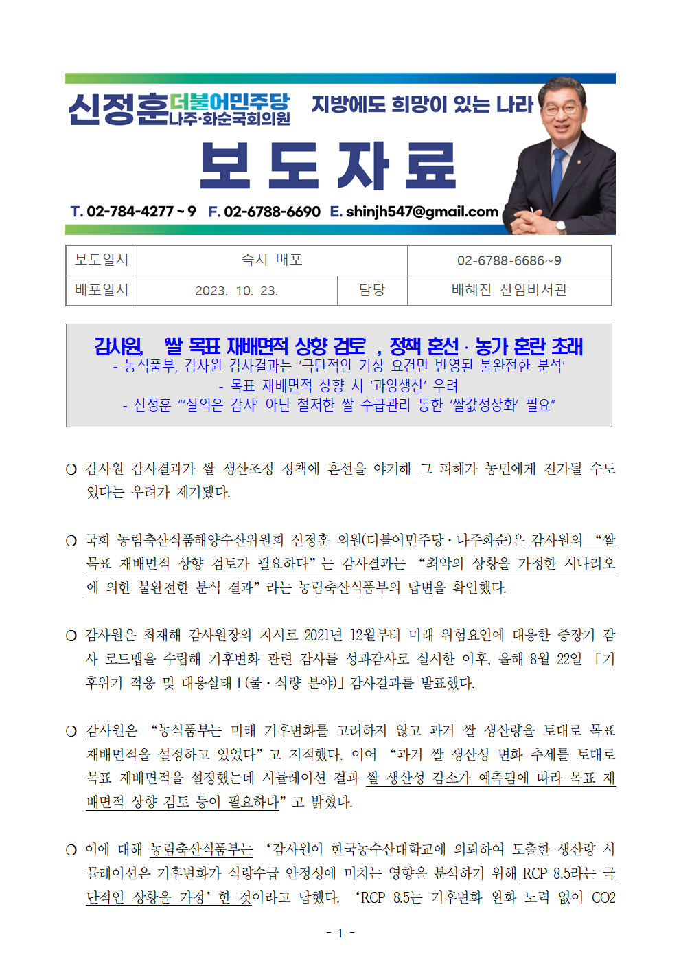 [신정훈 의원 보도자료] 감사원, ‘쌀 목표 재배면적 상향 검토’, 정책 혼선 ․ 농가 혼란 초래
