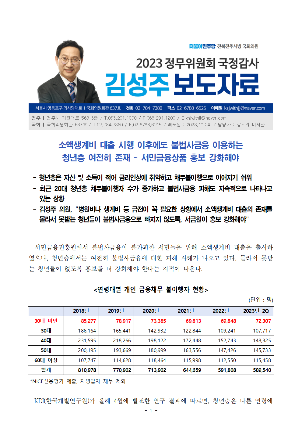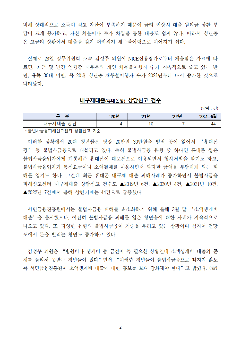 [김성주의원 보도자료] 소액생계비 대출 시행 이후에도 불법사금융 이용하는 청년층 여전히 존재 ‧‧‧ 서민금융상품 홍보 강화해야