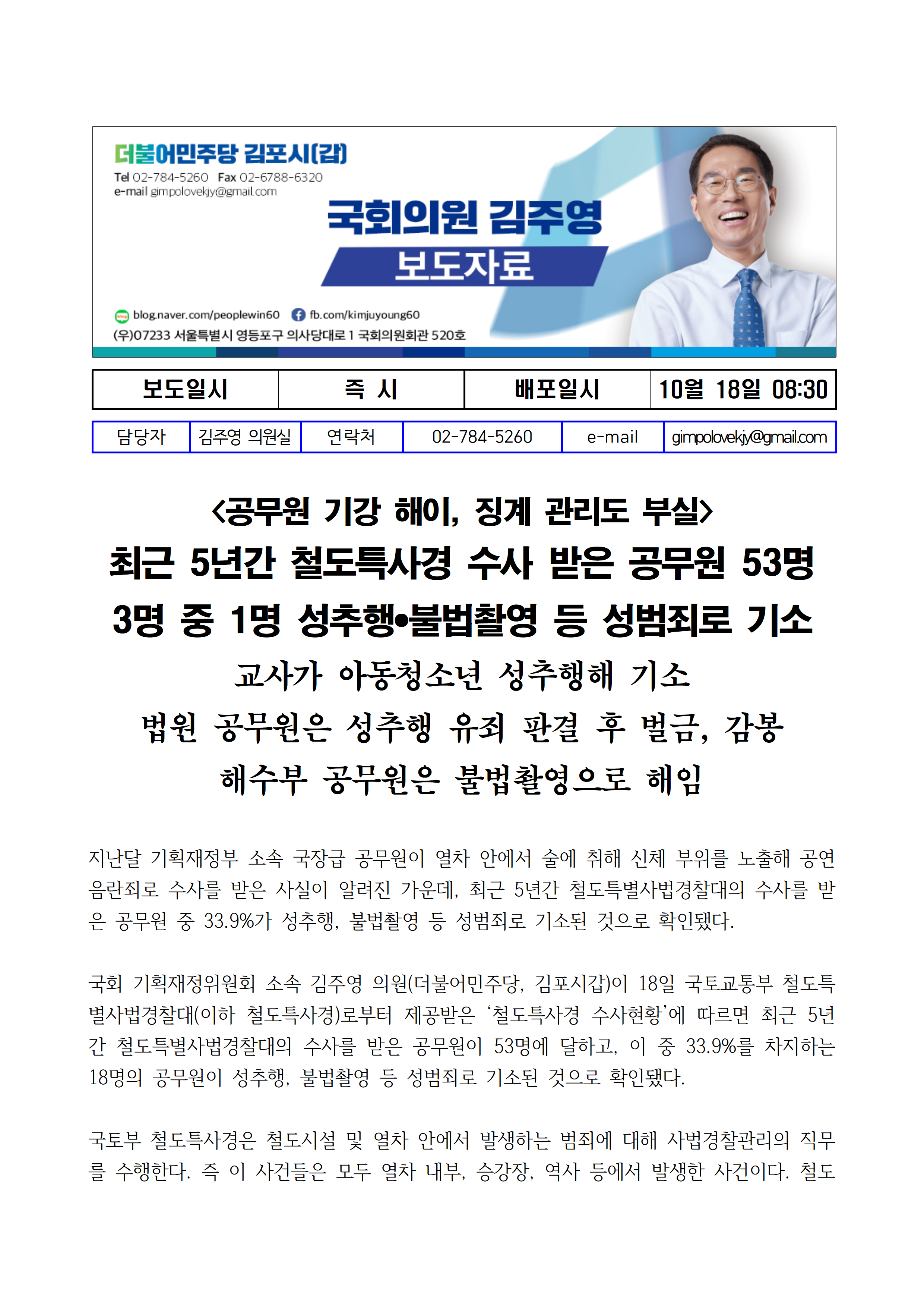 [김주영 의원 국감보도자료] <공무원 기강 해이, 징계 관리도 부실> 최근 5년간 철도특사경 수사 받은 공무원 53명 3명 중 1명 성추행•불법촬영 등 성범죄로 기소