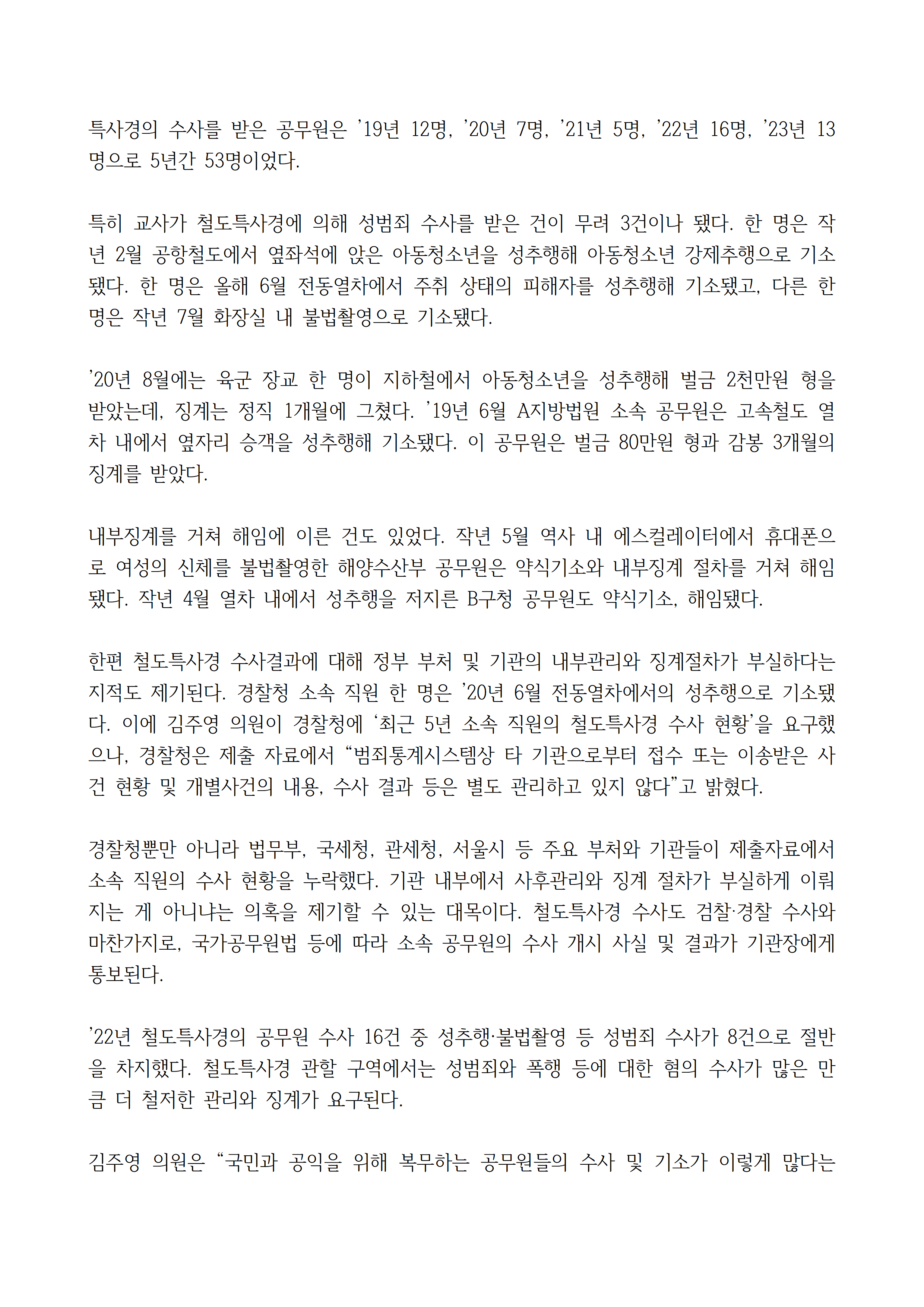 231018_국감보도자료_김주영_의원_최근 5년간 공무원 대상 철도특사경 수사현황_3명 중 1명은 성범죄.hwp