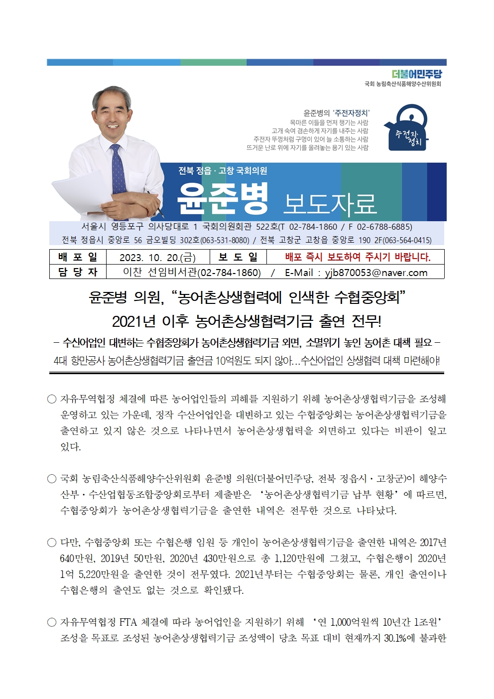 231020 [윤준병 의원 국정감사 보도자료] 윤준병 의원 2021년 이후 농어촌상생협력기금 출연 전무!.hwp