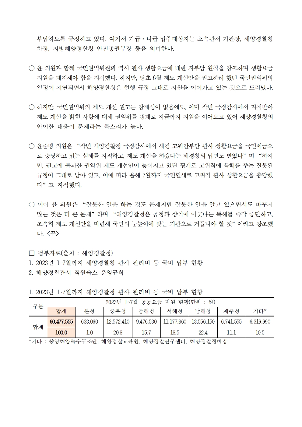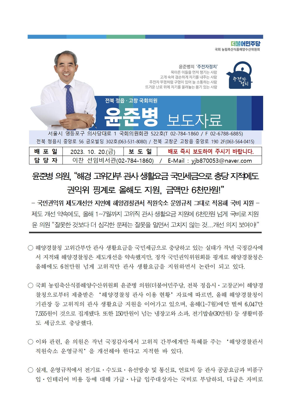 231020 [윤준병 의원 국정감사 보도자료] 윤준병 의원 “해경 고위간부 관사 생활요금 국민세금으로 충당 지적에도 권익위 핑계로 올해도 지원 금액만 6천만원!”.hwp
