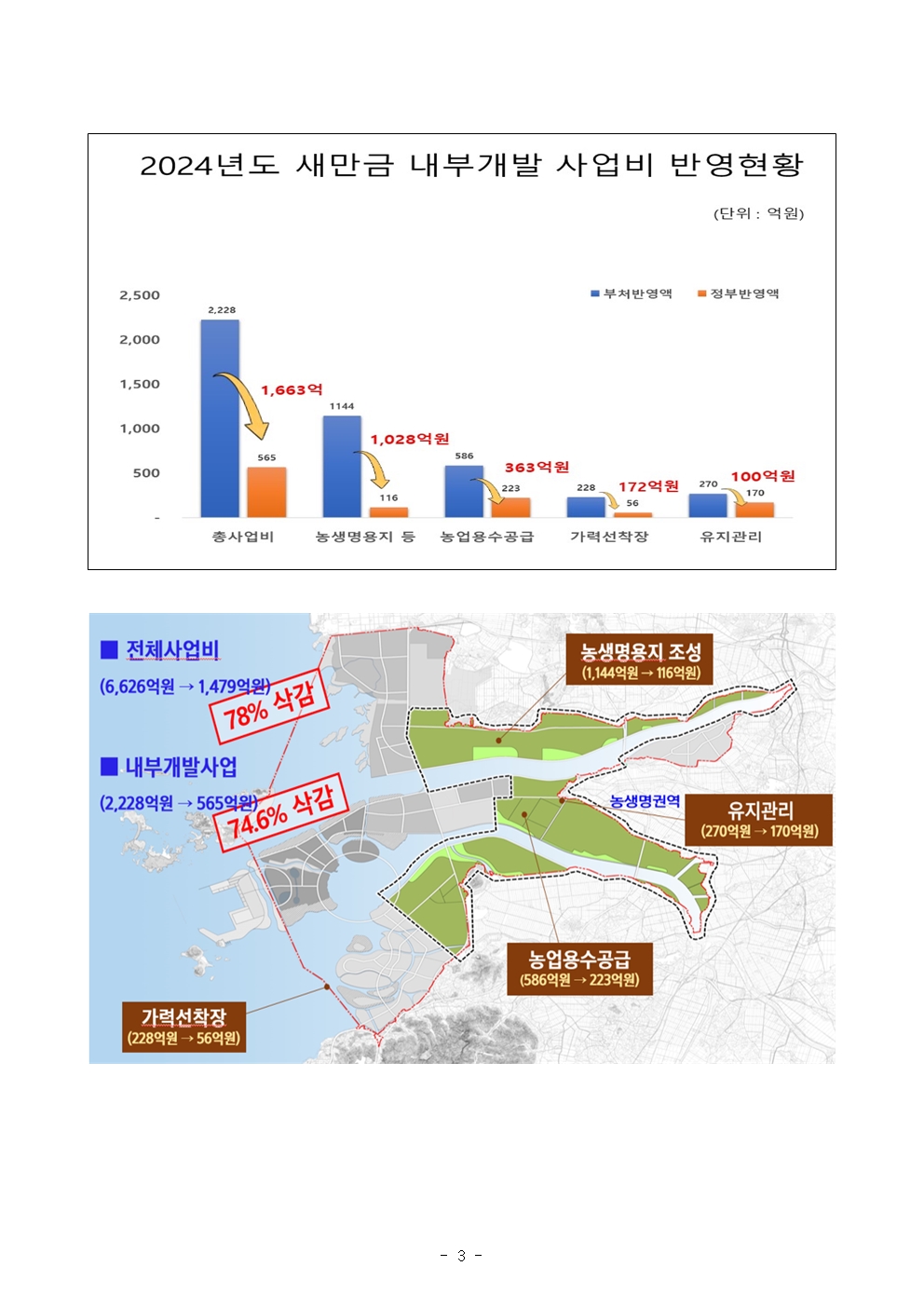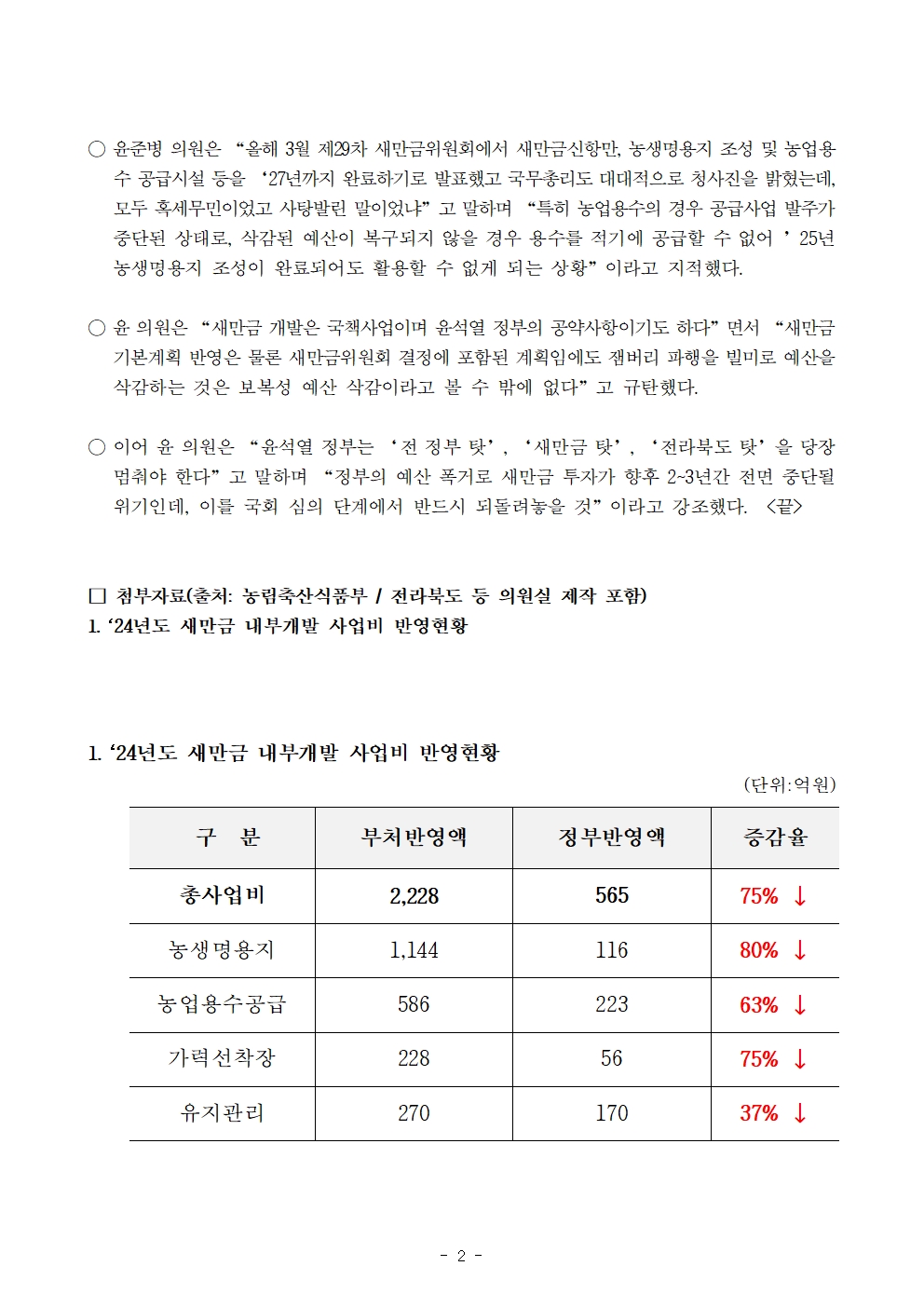 [윤준병 의원 국정감사 보도자료] 윤준병 의원, 새만금 내부개발 사업비 75% 삭감은 정치 보복이자 예산학살!