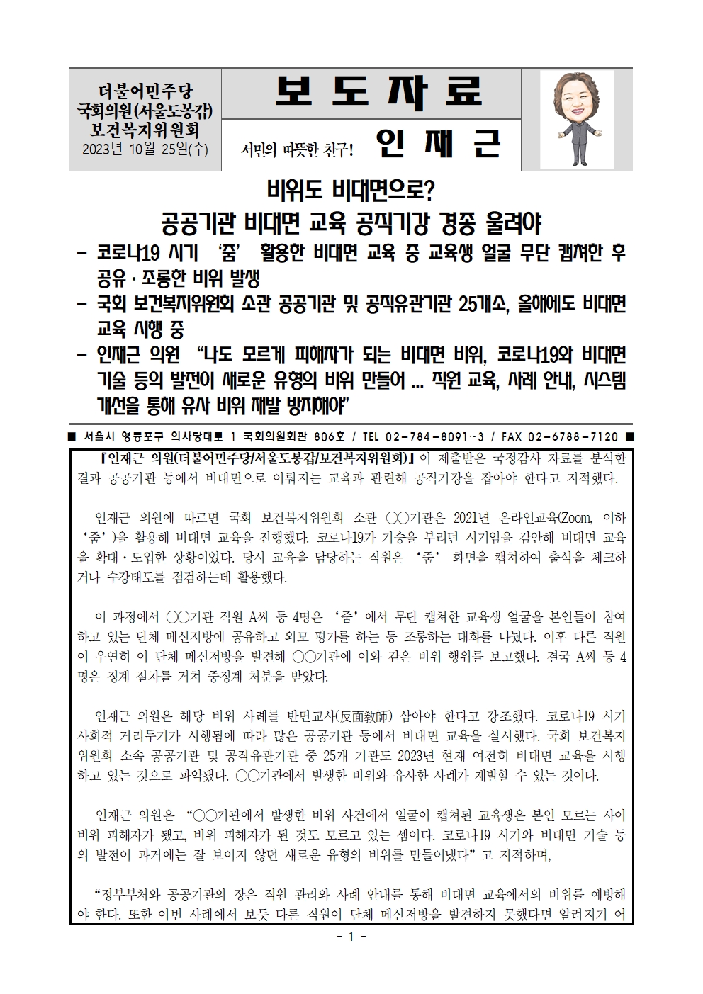 [인재근의원실 보도자료] 비위도 비대면으로? 공공기관 비대면 교육 공직기강 경종 울려야