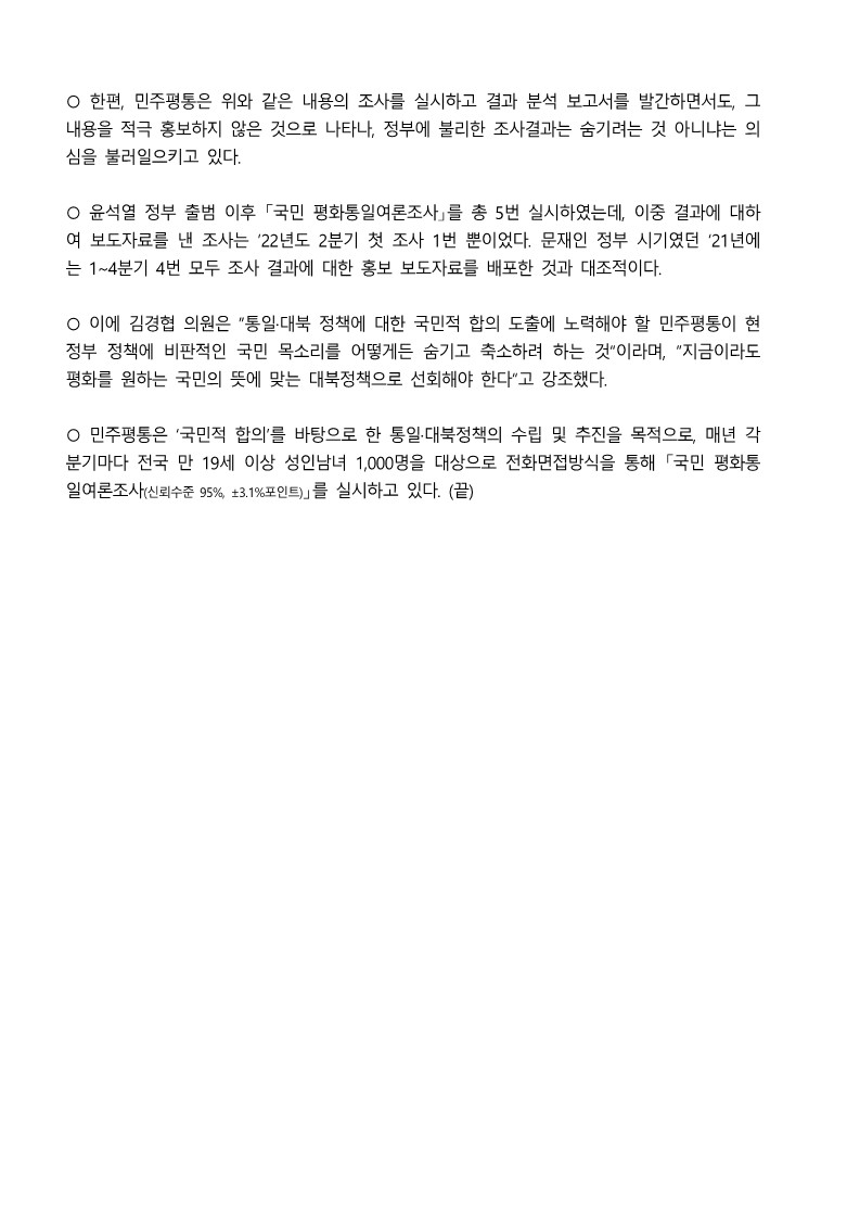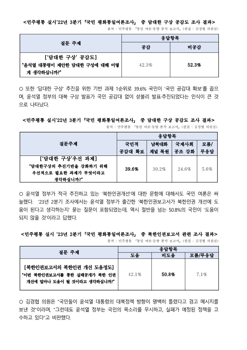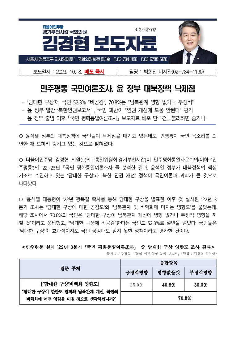 [국회의원 김경협 국정감사 보도자료] 민주평통 국민여론조사, 윤 정부 대북정책 낙제점