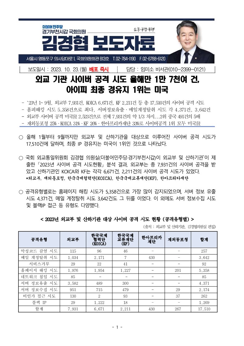 [국회의원 김경협 국정감사 보도자료] 외교 기관 사이버 공격 시도 올해만 1만 7천여 건, 아이피 최종 경유지 1위는 미국