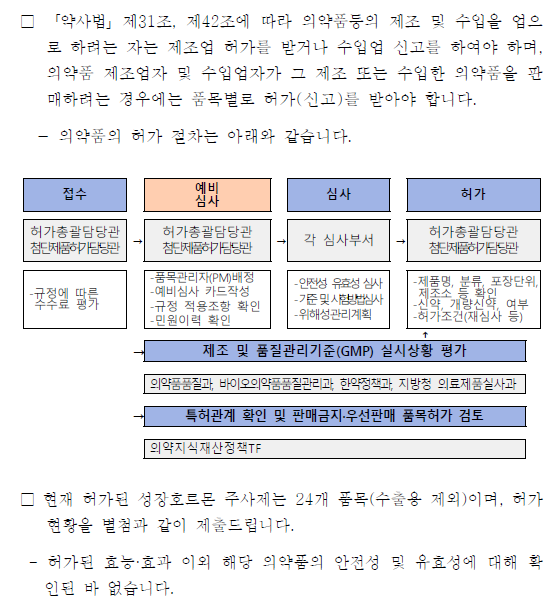 연간 1천만원 키크는주사, 식약처는 ‘효능효과 확인된 바 없다’ 일반인에 대한 임상시험조차 시행한 적 없어 ▴ 국내 의료기관에서 처방되고 있는 성장호르몬 바이오의약품 총24개 ▴ 24개 제품 모두 터너증후근 및 성장호르몬이 부족한 환자 대상 임상시험 ▴ 일반인을 대상으로 임상시험한 적 한차례도 없어(식약처 공식확인) ▴ 식약처, “해당 바이오의약품 효능, 효과 확인된 바 없다”는 입장 ▴ 김영주 의원, “효능, 효과 검정 안 된 의약품 오남용 방지해야”
