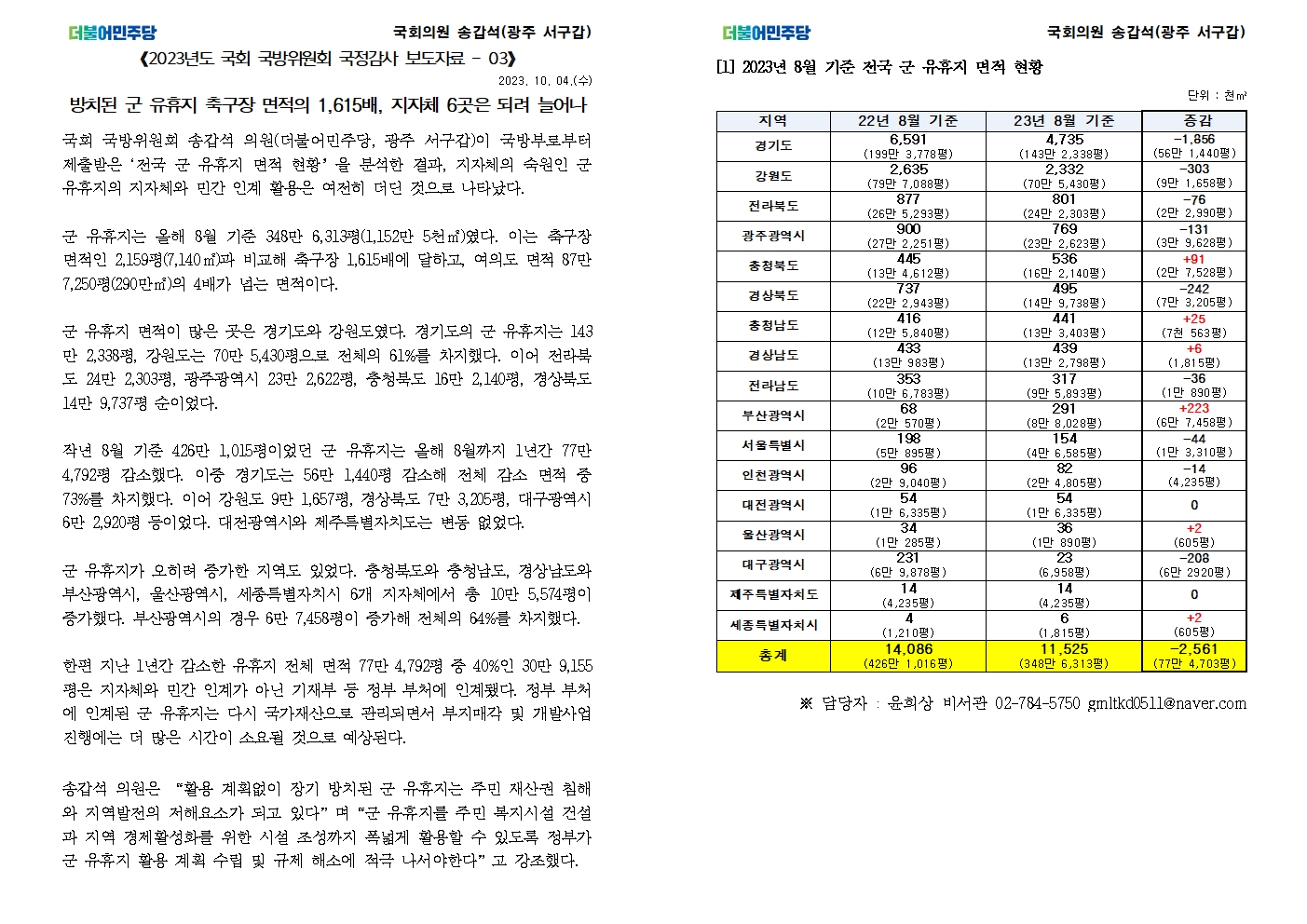 [국회의원 송갑석 국정감사 보도자료] 방치된 군 유휴지 축구장 면적의 1,615배, 지자체 6곳은 되려 늘어나