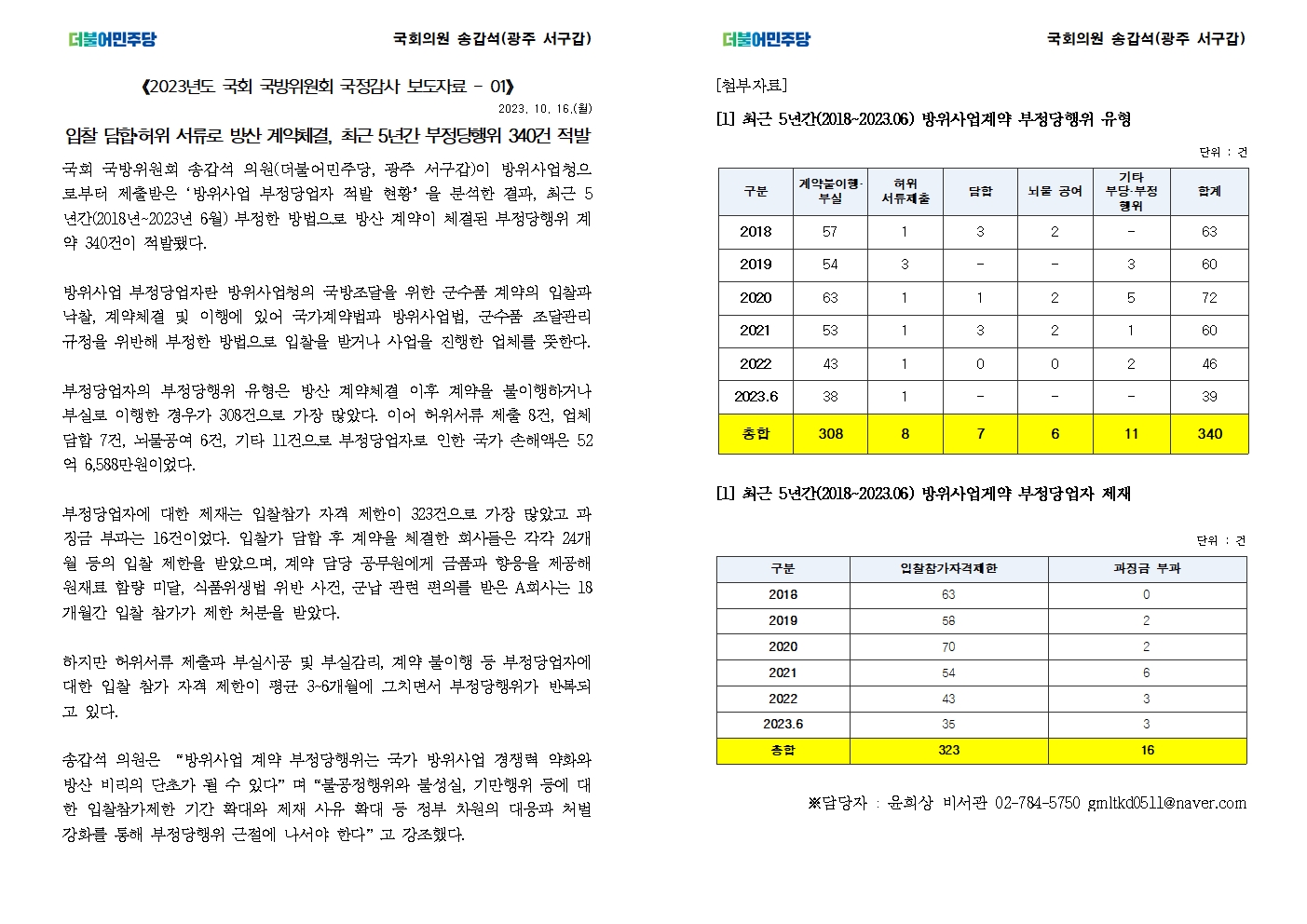 [국회의원 송갑석 국정감사 보도자료] 입찰,담합,허위 서류로 방산 계약체결, 최근 5년간 부정당행위 340건 적발