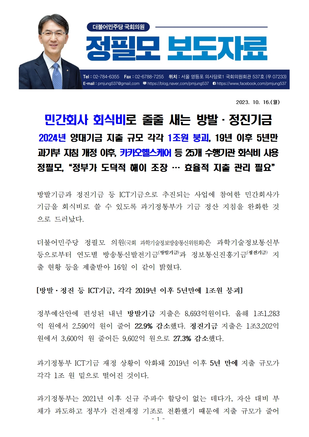 231016_국정감사_보도자료_민간회사_회식비로_줄줄_새는_방발·정진기금_정필모의원_수정.hwp