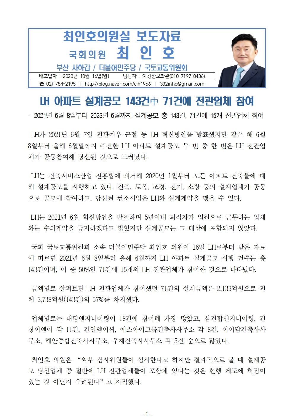 [최인호 의원 보도자료]LH 아파트 설계공모 143건中 71건에 전관업체 참여