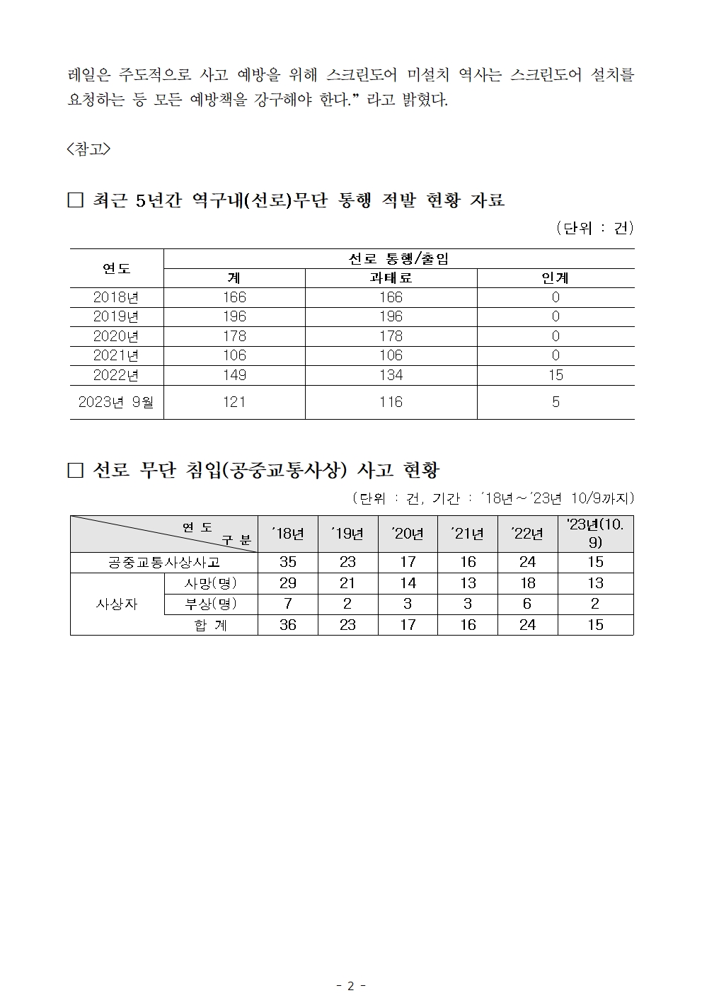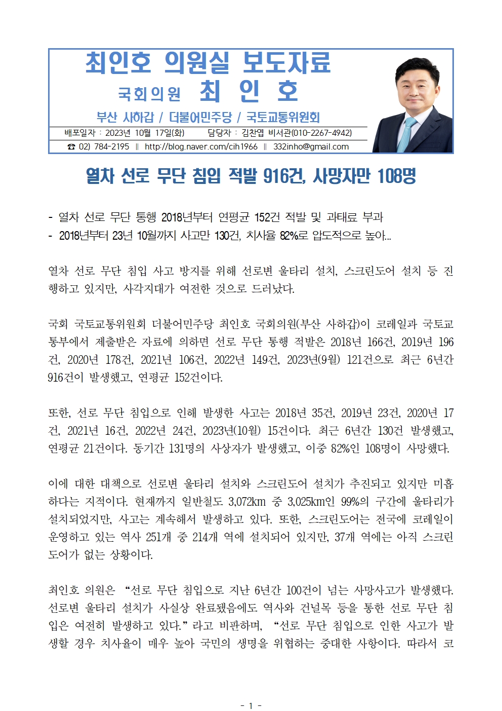 (보도자료)231017_최인호_열차 선로 무단 침입 적발916건 사망자만 108명.hwp