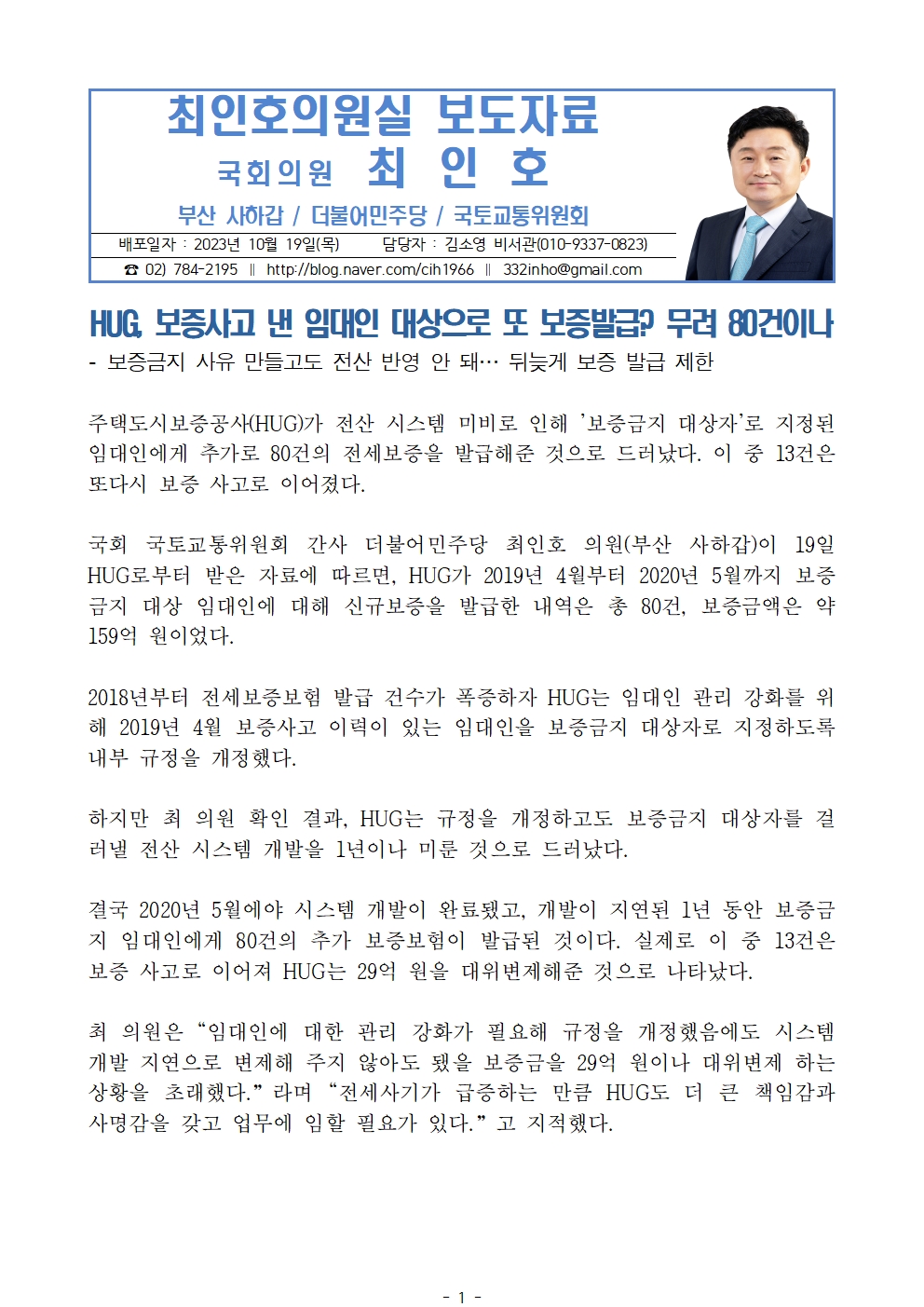 [최인호 의원 보도자료]HUG, 보증사고 낸 임대인 대상으로 또 보증발급? 무려 80건이나