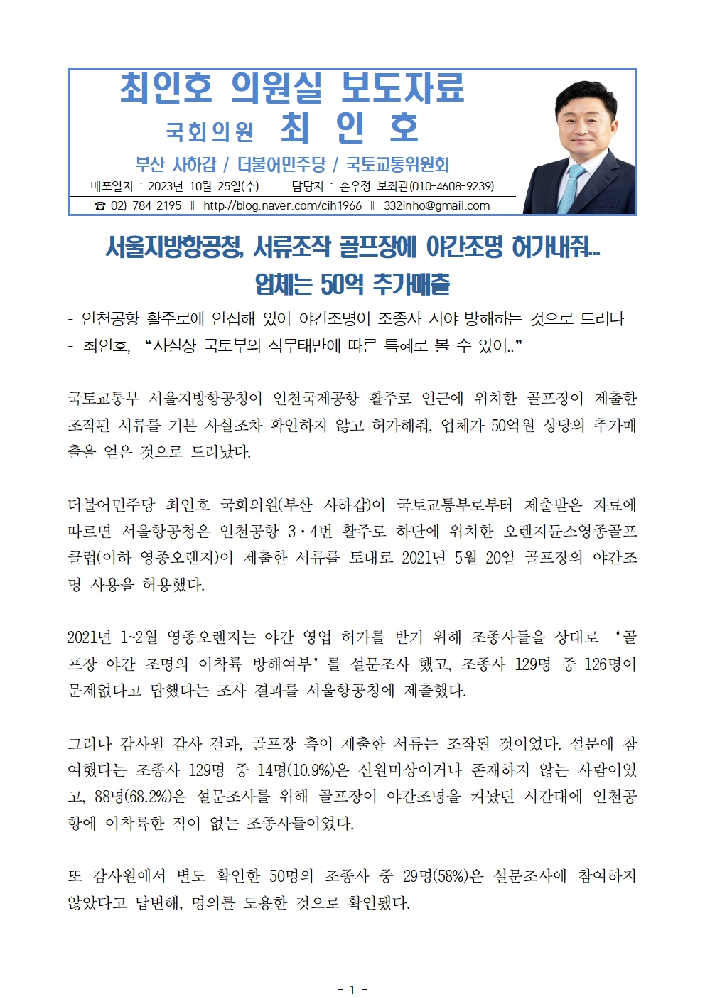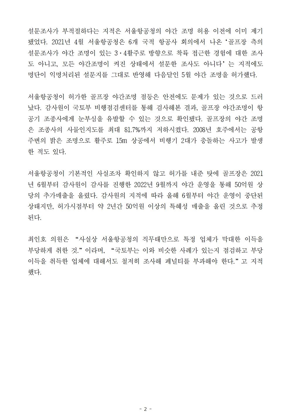 [최인호 의원 보도자료] 서울지방항공청, 서류조작 골프장에 야간조명 허가내줘... 업체는 50억 추가매출