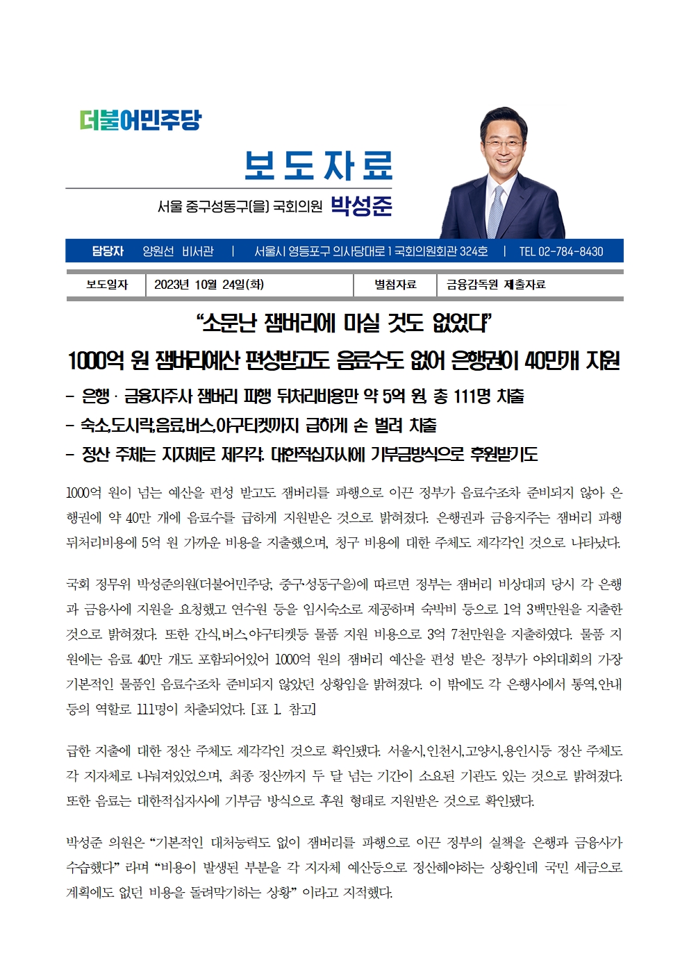[국회의원 박성준_보도자료]'소문난 잼버리에 마실 것도 없었다'_1000억 원 잼버리예산 편성받고도 음료수도 없어 은행권이 40만개 지원