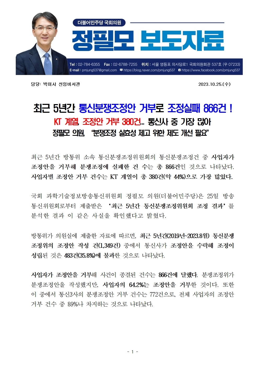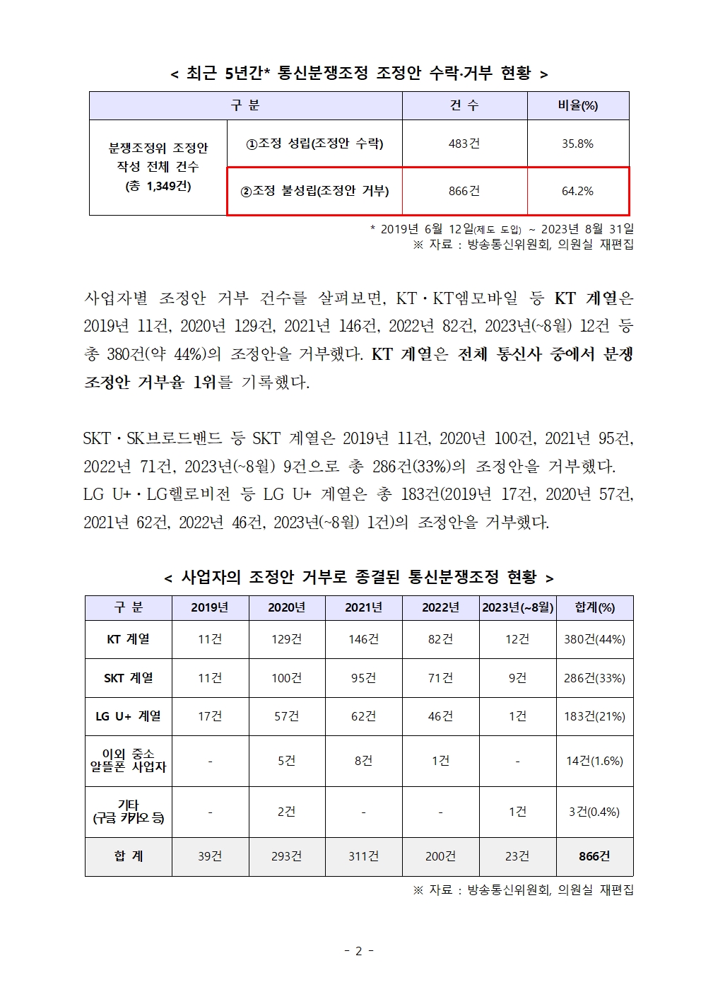 231025_보도자료_최근_5년간_통신분쟁조정안_거부로_조정실패_866건KT계열_가장_많아.hwp