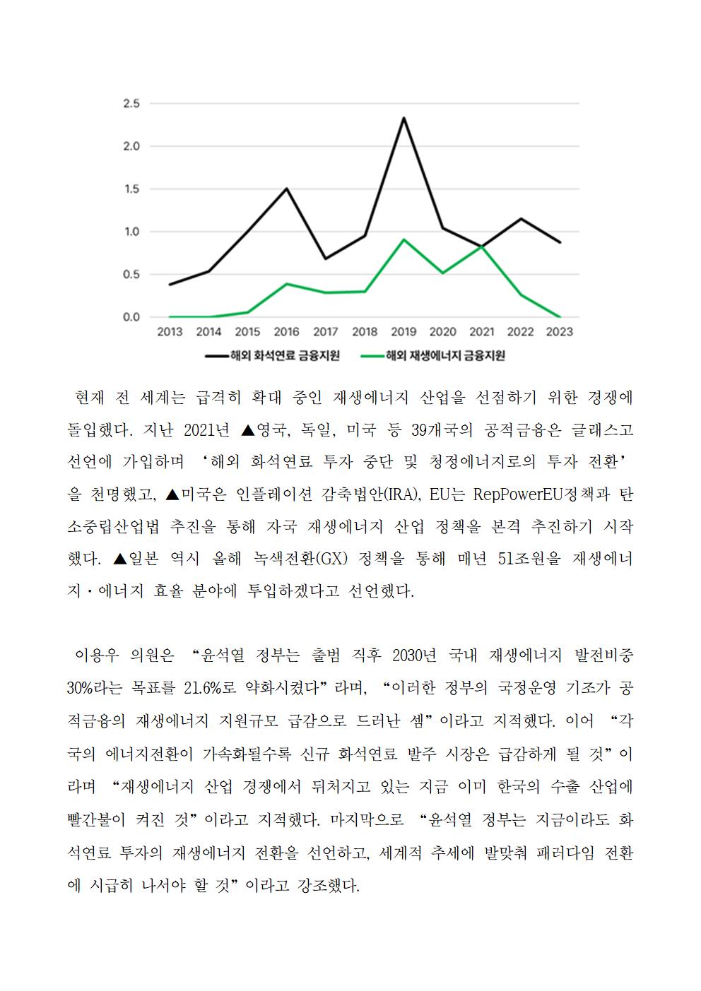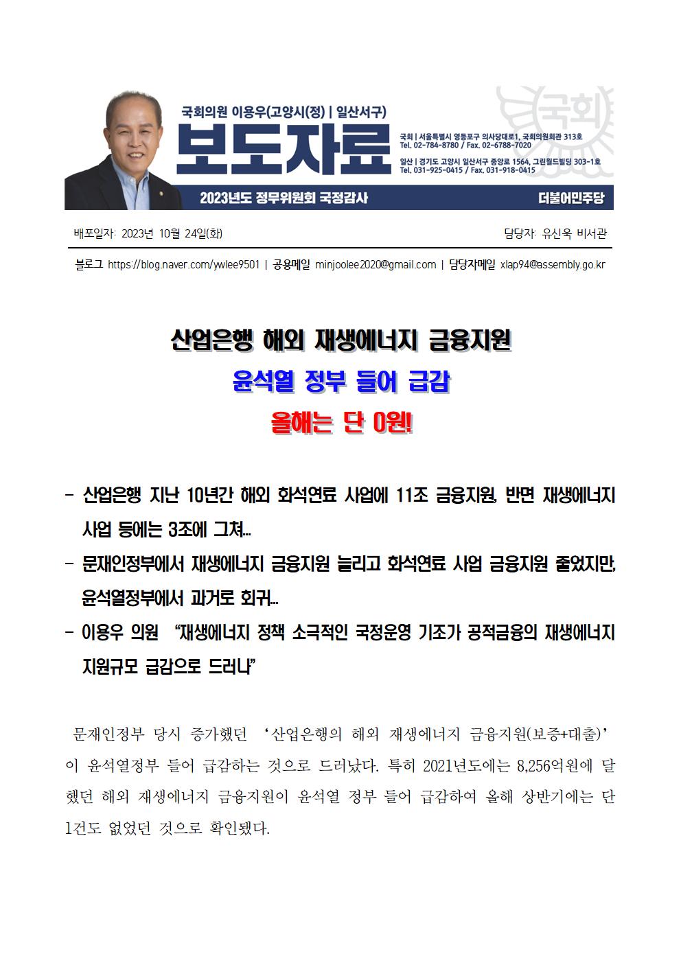 [이용우 의원] 산업은행 해외 재생에너지 금융지원 윤석열 정부 들어 급감 올해는 단 0원!