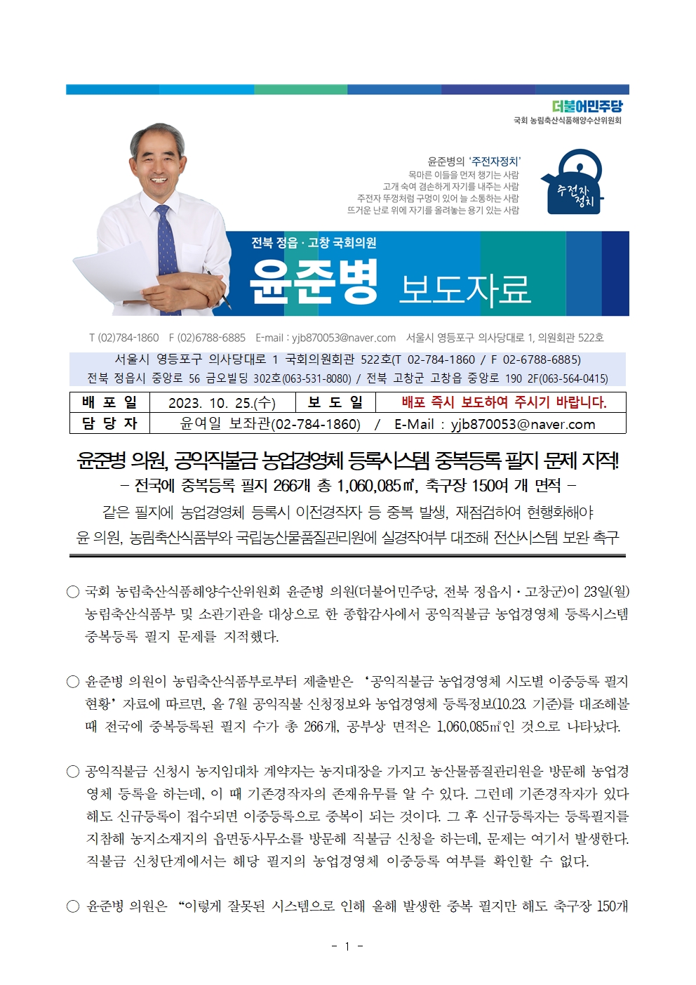 231025 [윤준병 의원 국정감사 보도자료] 윤준병 의원_ 공익직불금 농업경영체 등록시스템 중복등록 필지 문제 지적! (1).hwp