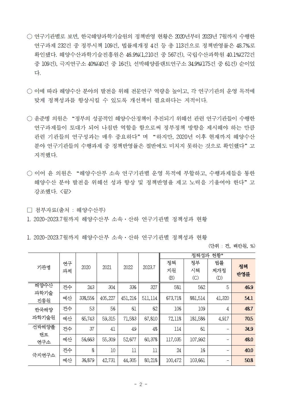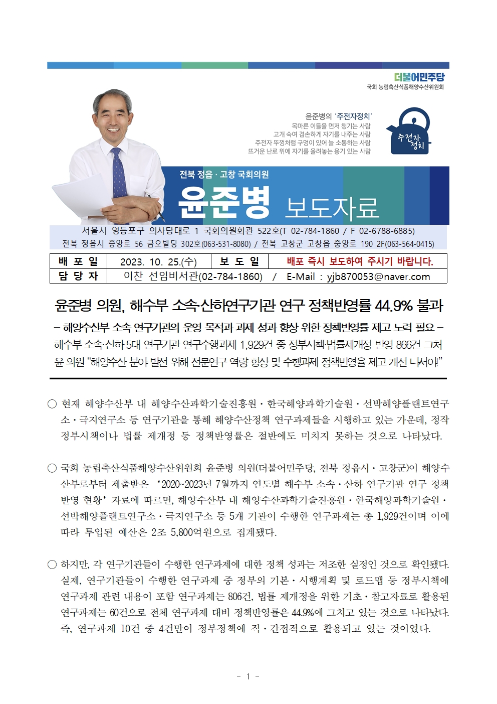 [윤준병 의원 국정감사 보도자료] 윤준병 의원_ 해수부 소속·산하연구기관 연구 정책반영률 44.9% 불과