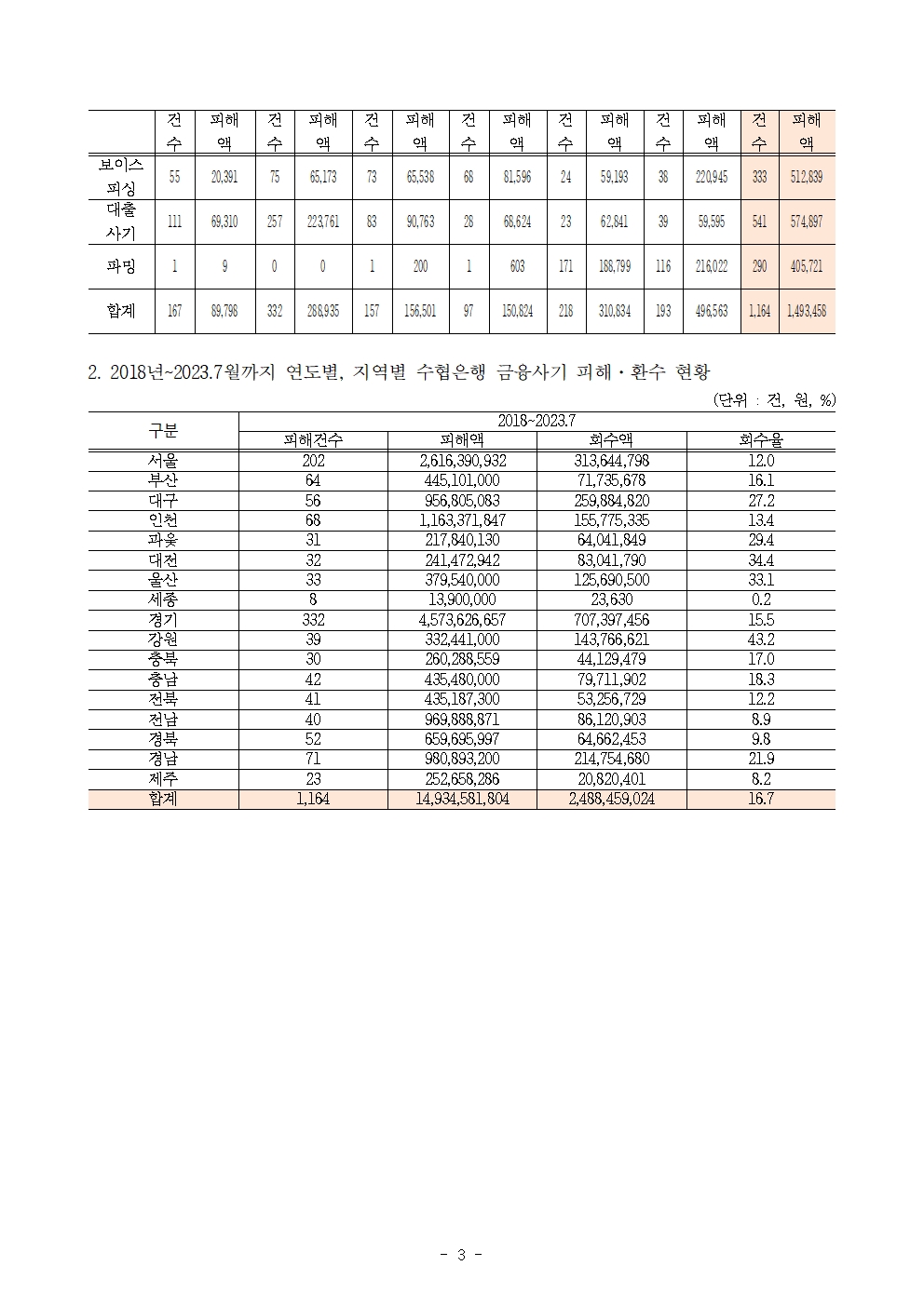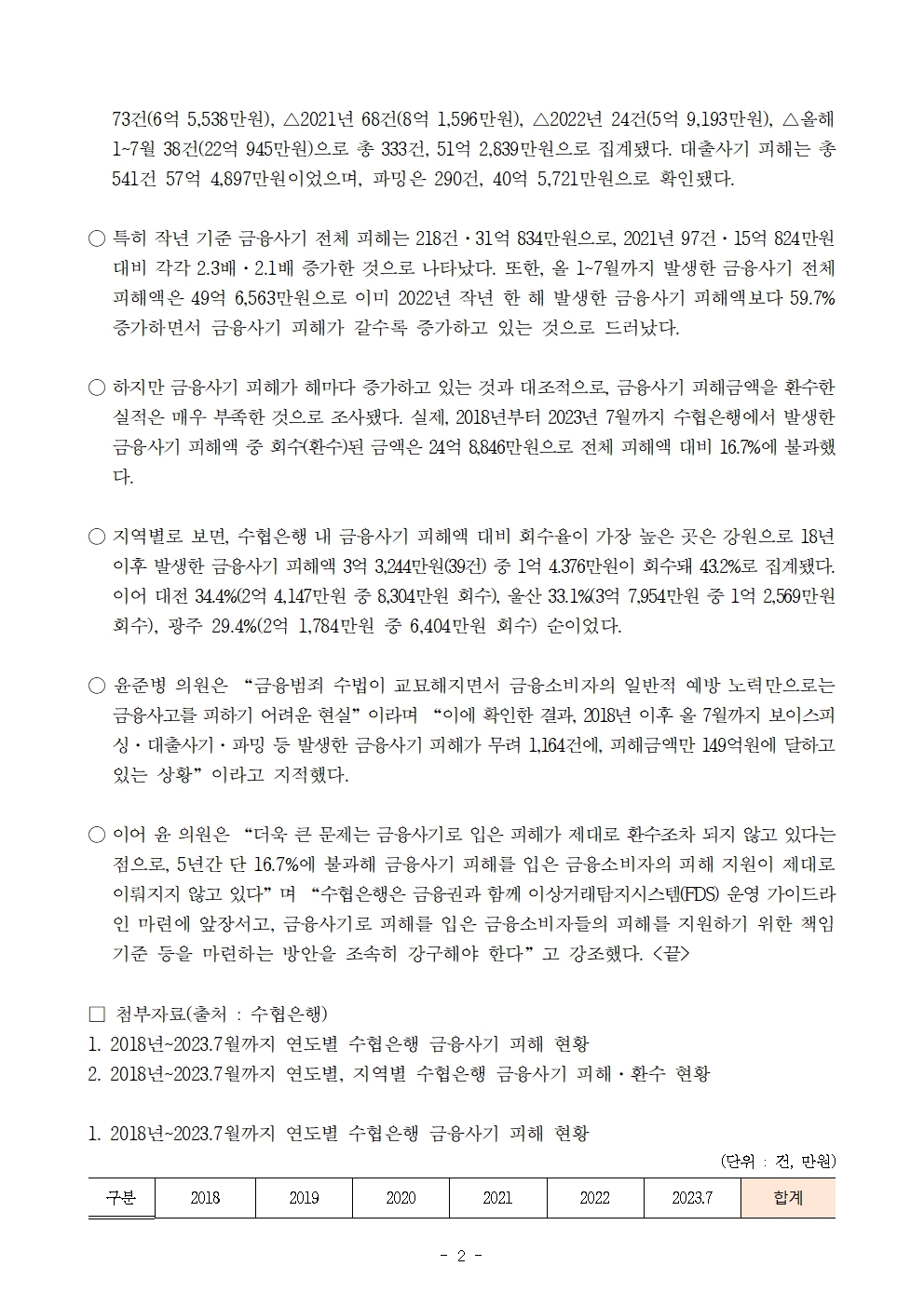 231025 [윤준병 의원 국정감사 보도자료] 윤준병 의원 수협은행 5년간 금융사기 피해액 149억원 중 17%만 회수.hwp