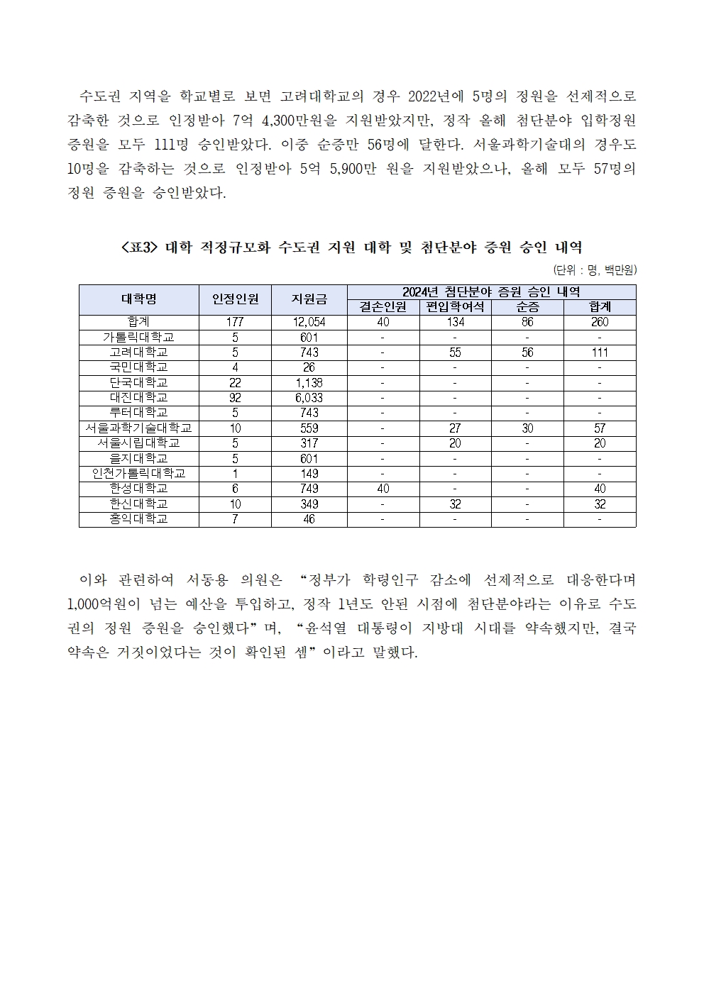 [서동용 의원] 22년 자발적 정원감축에 적정규모화 지원금 1,400억원 준 윤석열 정부, 올해는 첨단분야 인력양성 핑계로 수도권 정원 오히려 늘려