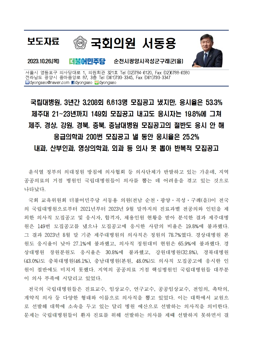 231026_국감_서동용_국립대병원_3년간_3208회_6613명_모집공고_냈지만_응시율은_53_3퍼센트.hwp