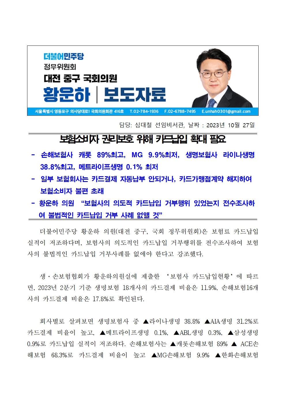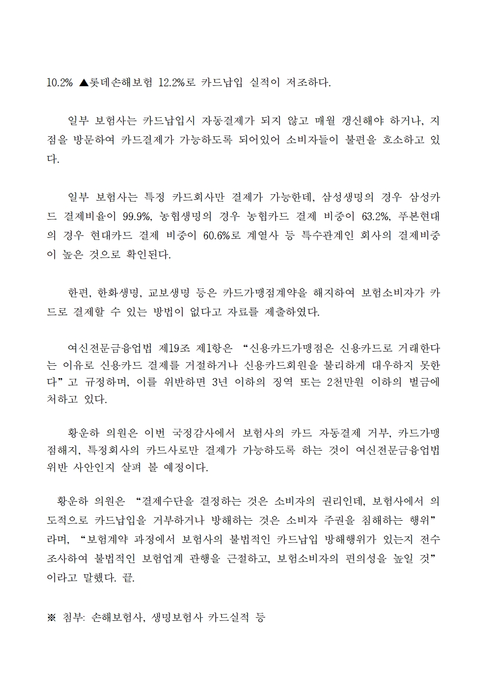 [황운하의원 보도자료] 보험소비자 권리보호 위해 카드납입 확대 필요