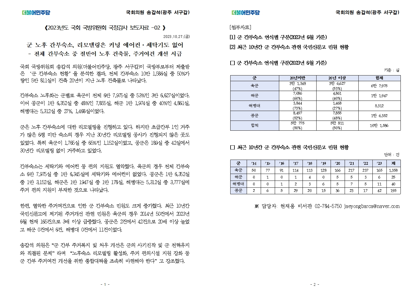 [국회의원 송갑석 국정감사 보도자료] 군 노후 간부숙소, 리모델링은 커녕 에어컨·세탁기도 없어