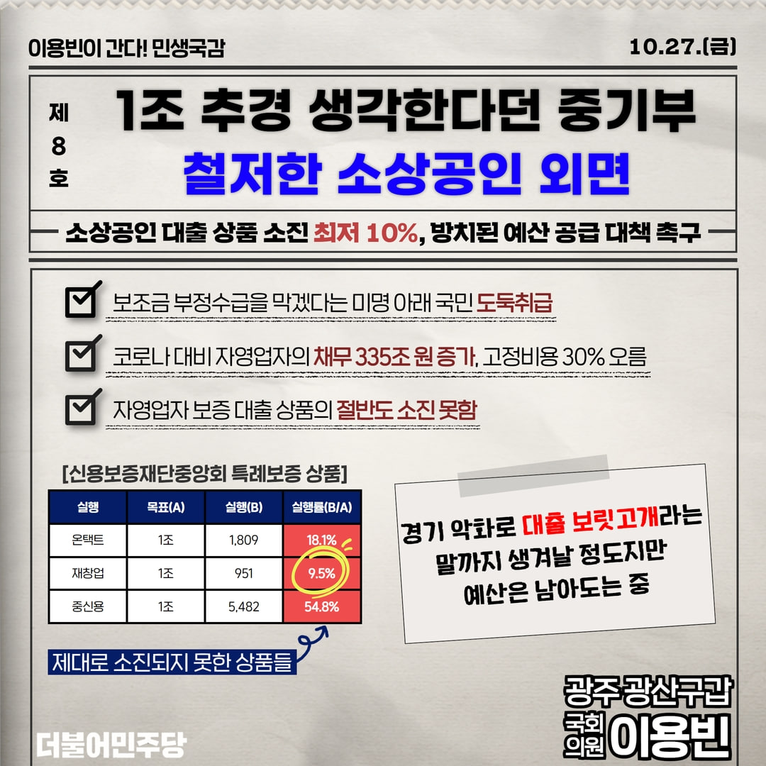 이미 자영업자 보증 대출 상품 중에 절반도 소진되지 못한채 방치된 예산들에 대한 개선책과 약속했던 대책을 마련할 것을 요구했습니다.