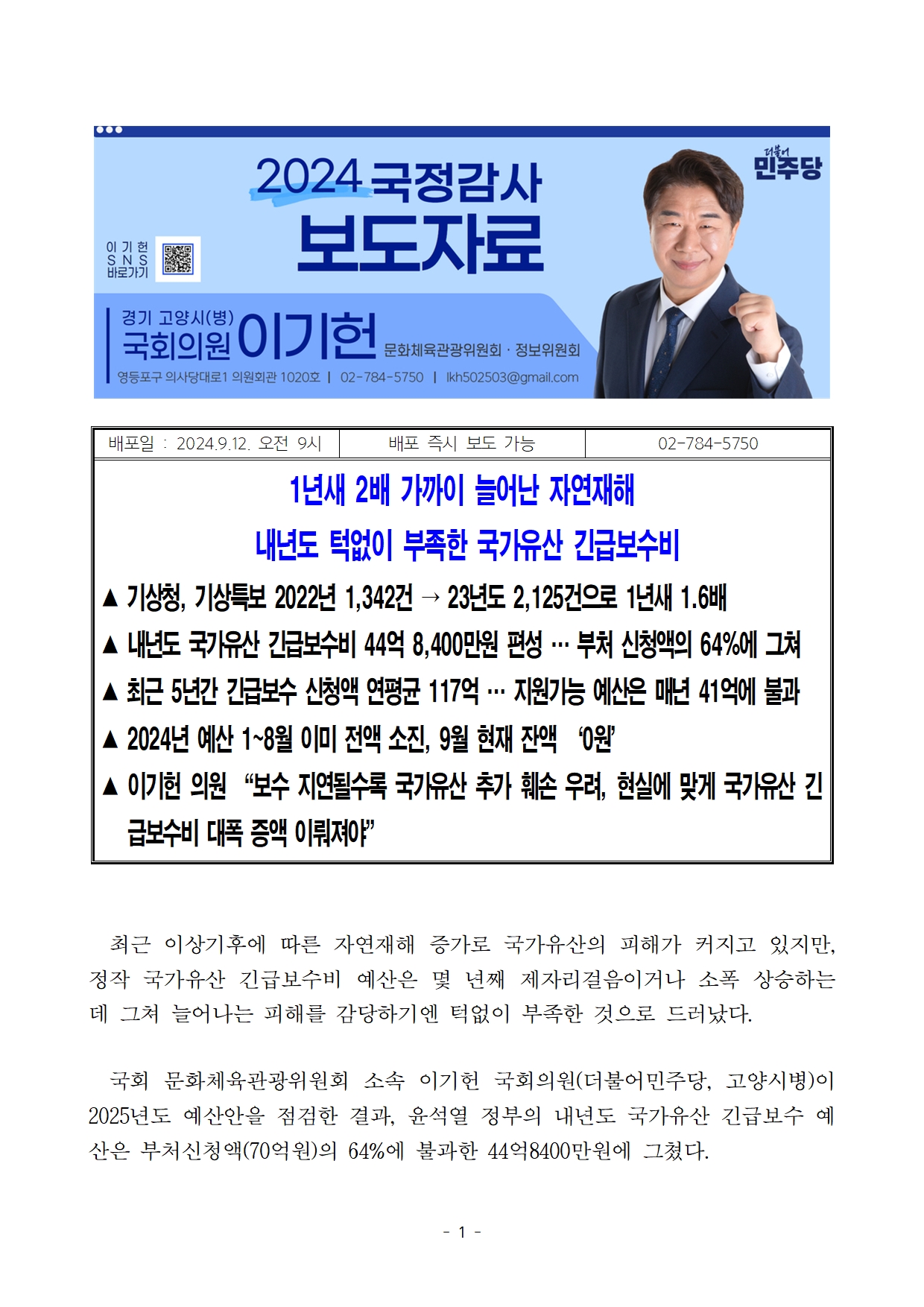 [이기헌 의원(고양시 병) 보도자료] 자연재해 대비 턱없이 부족한 국가유산 긴급보수비