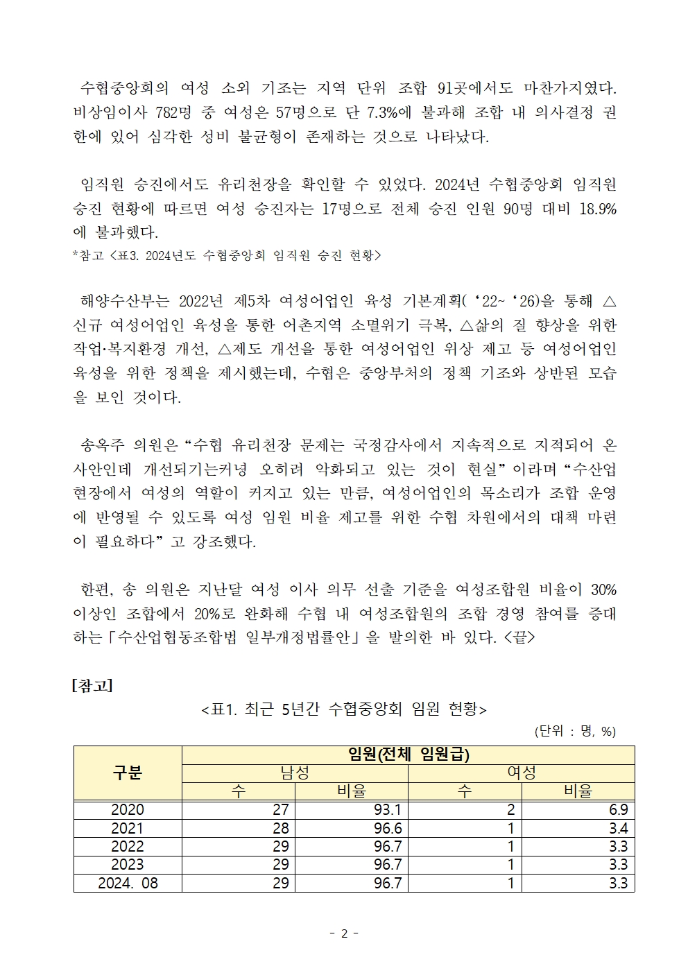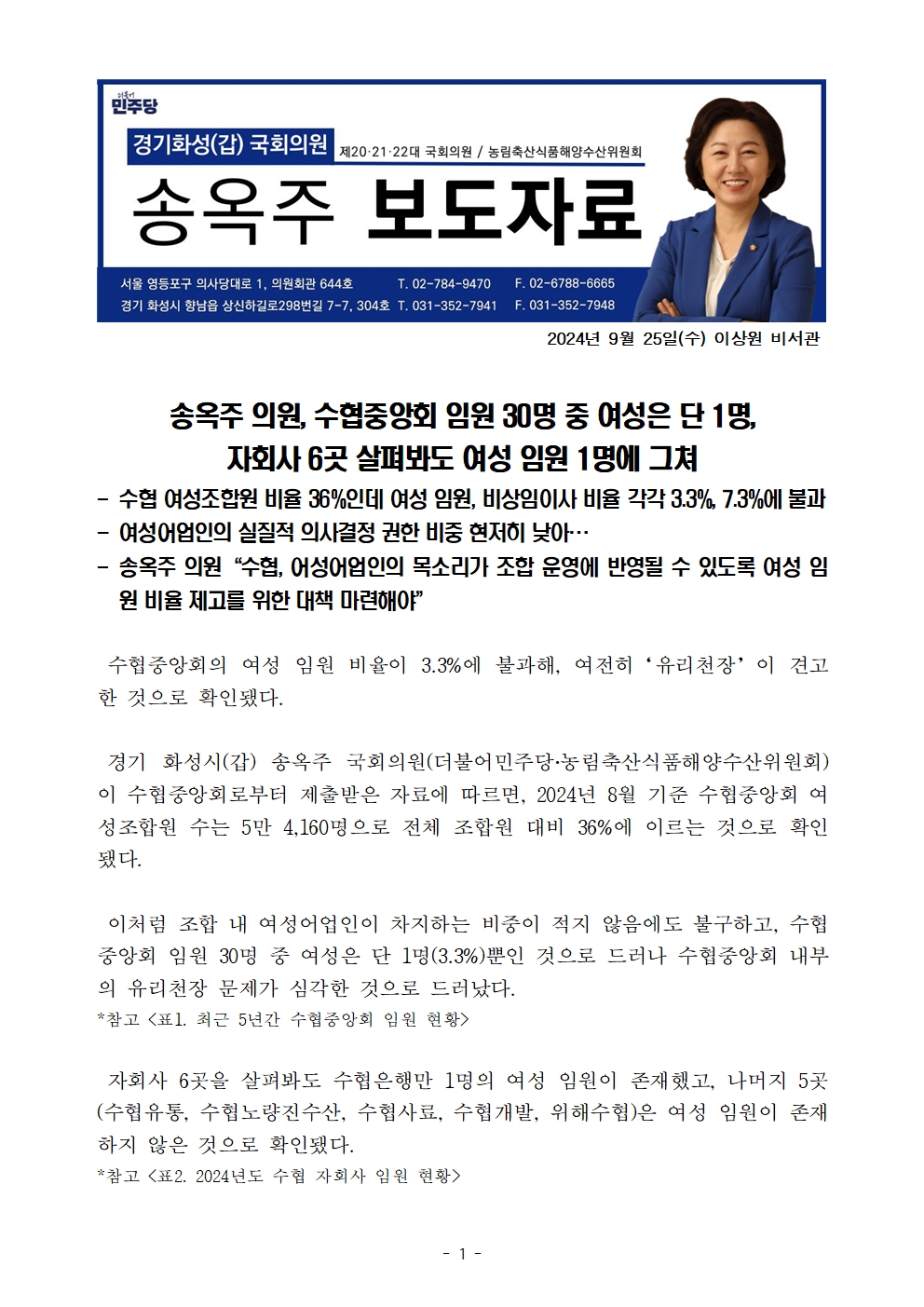 보도자료_송옥주 의원 수협중앙회 임원 30명 중 여성은 단 1명 자회사 6곳 살펴봐도 여성 임원 1명에 그쳐.hwp