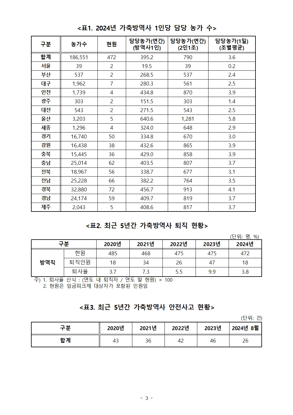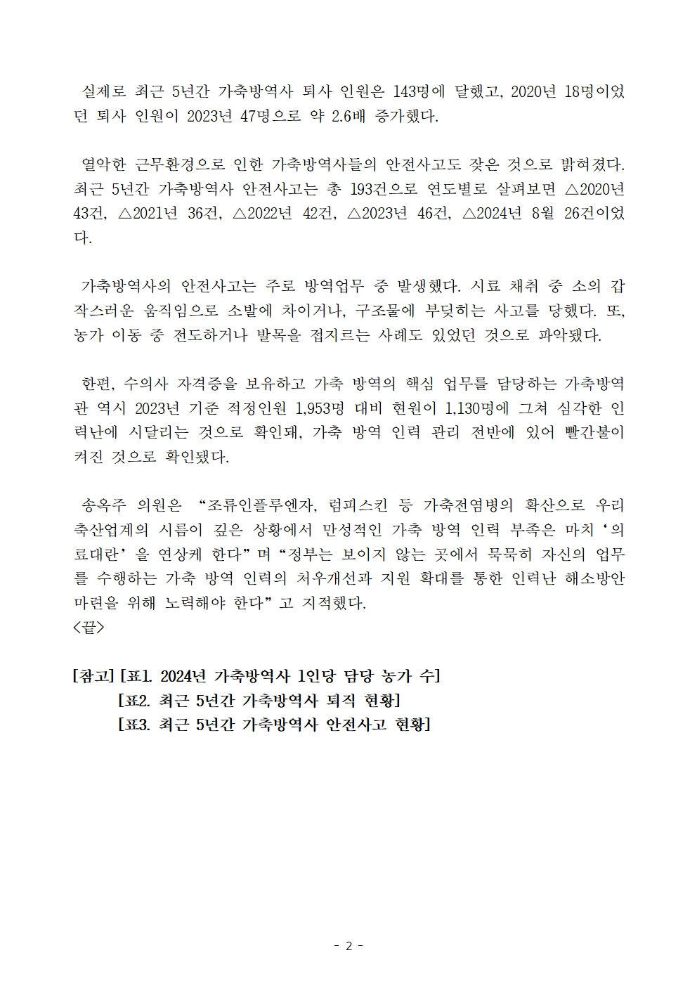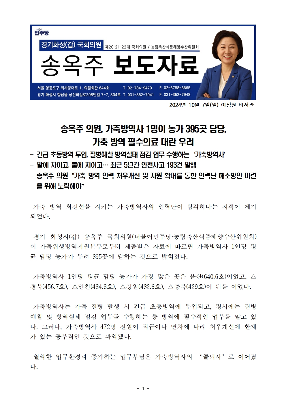 [국회의원 송옥주 국정감사 보도자료] 가축방역사 1명이 농가 395곳 담당, 가축 방역 필수의료 대란 우려