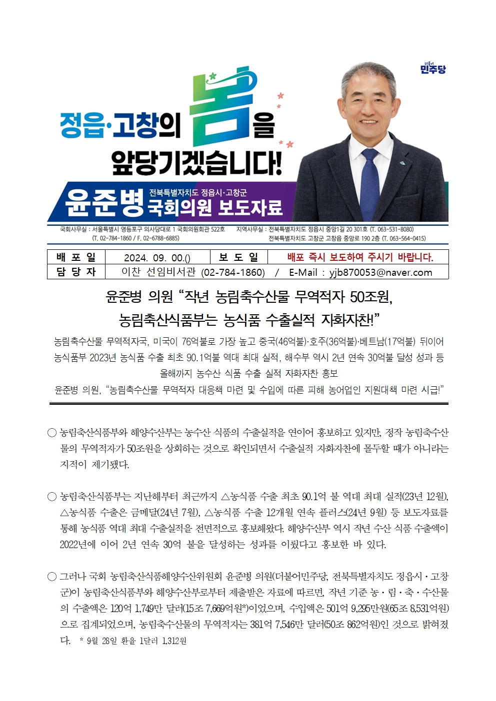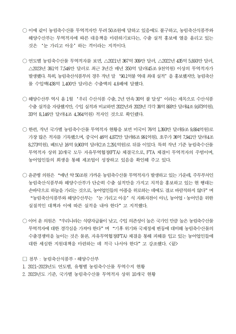 [윤준병 의원 국정감사 보도자료] 작년 농수산물 무역적자 50조원_ 부처는 수출실적 자화자찬!