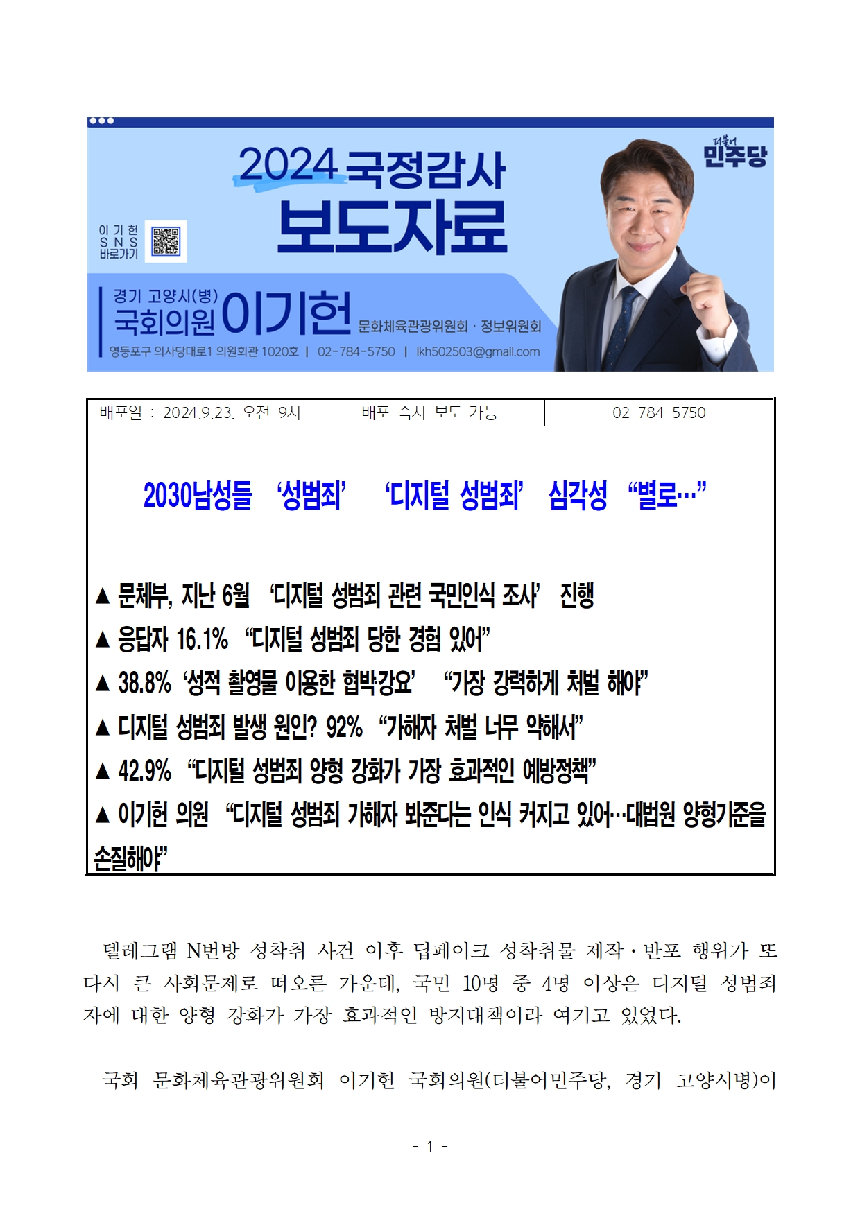 [이기헌 의원(고양시 병) 보도자료] 2030남성들 '성범죄' '디지털 성범죄' 심각성 별로
