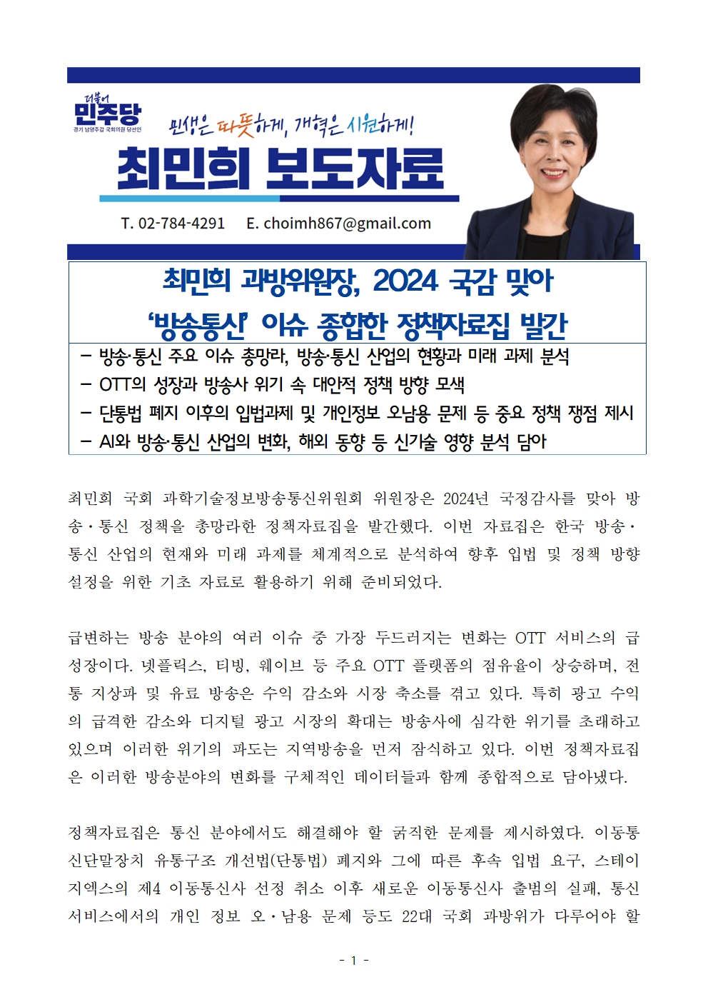 [국회의원 최민희] 최민희 과방위원장, 2024 국감 맞아 ‘방송통신’ 이슈 종합한 정책자료집 발간