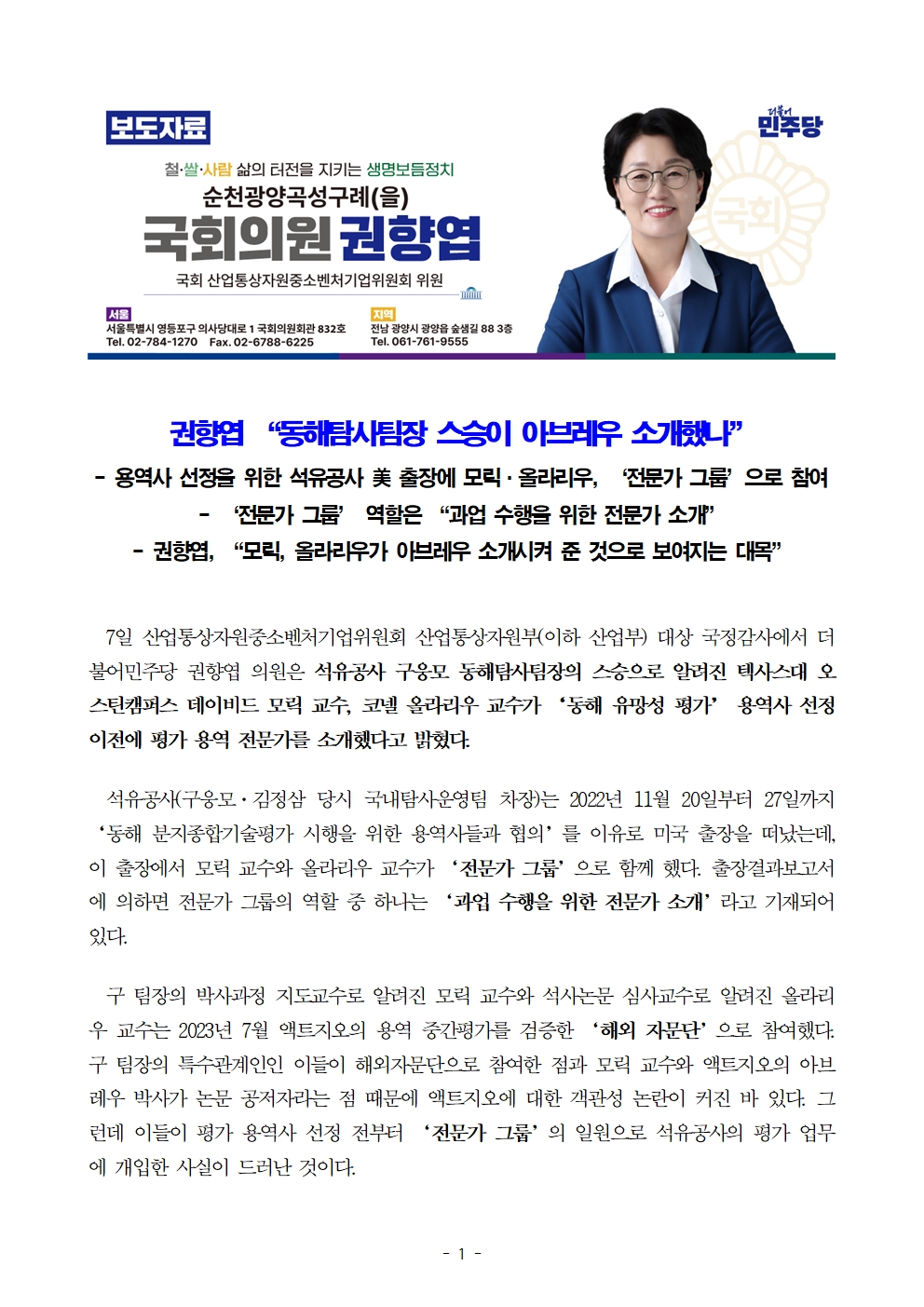 [권향엽 국회의원] 241007 보도자료_권향엽 동해탐사팀장 스승이 아브레우 소개했나.hwp