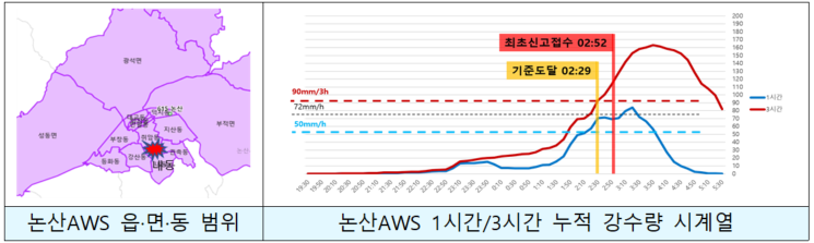 한편, 같은 날 충북 영동군에서도 폭우로 저수지가 범람해 70대 남성이 급류에 휩쓸려 실종되는 사건이 발생했다. 당시 ‘영동AWS(방재자동기상관측장비) 누적 강수량’을 보면 영동군에서 내린 비가 기상청 재난 문자(CBS) 발송 기준에 도달한 시간은 오전 4시 28분이다. 최초 사고가 접수된 오전 5시 27분보다 1시간가량 앞선 시점이다.