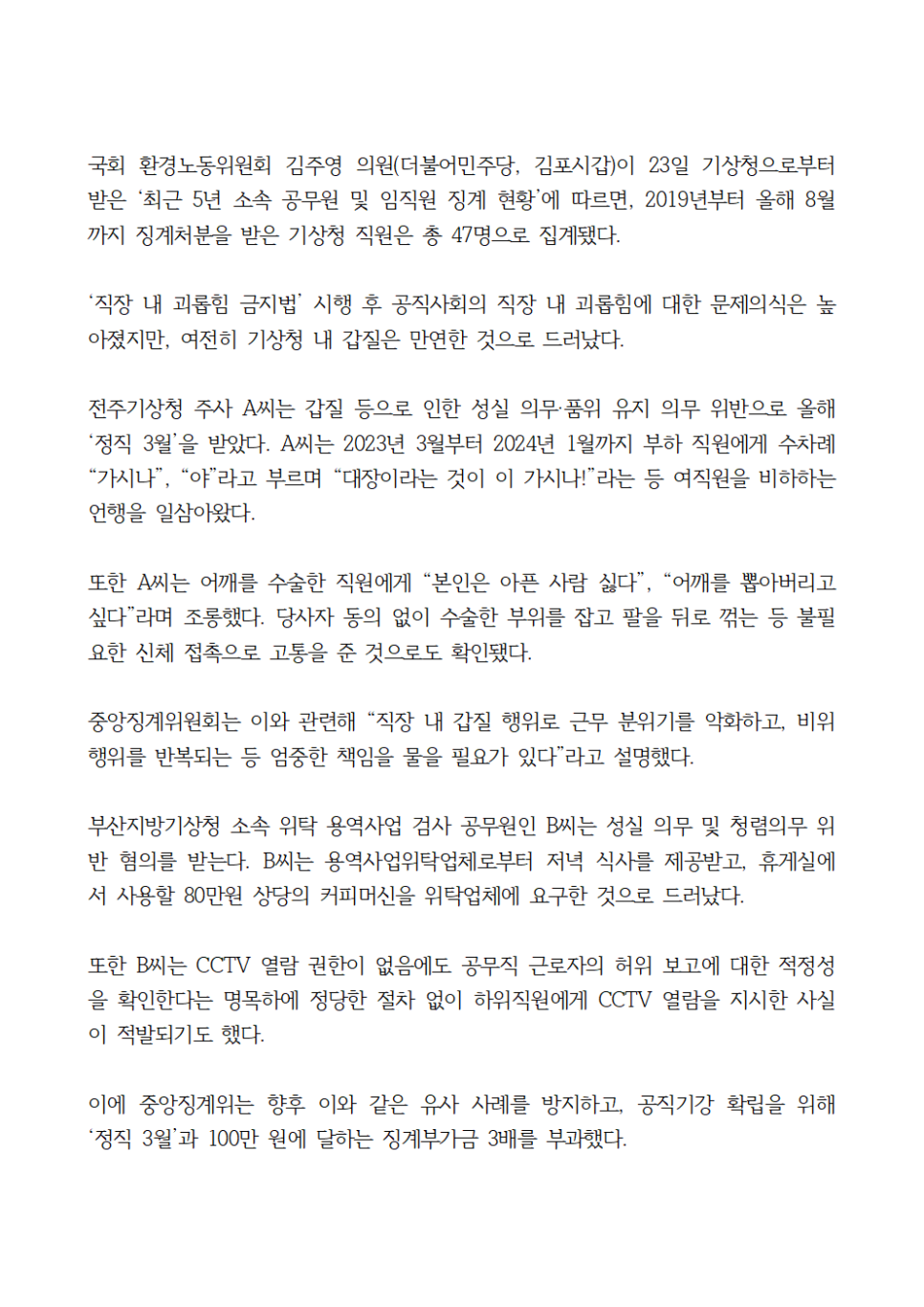 최근 5년간 직장 내 갑질과 절도, 음주 운전 등 각종 비위 혐의로 징계처분을 받은 기상청 직원이 47명에 달하는 것으로 나타났다. 특히 부하 직원에 대한 비하와 CCTV 무단열람 지시 등 기상청 내 갑질이 매년 심각한 수준에 이르는 가운데 해이해진 공직기강을 바로 잡아야 한다는 지적이 제기된다.