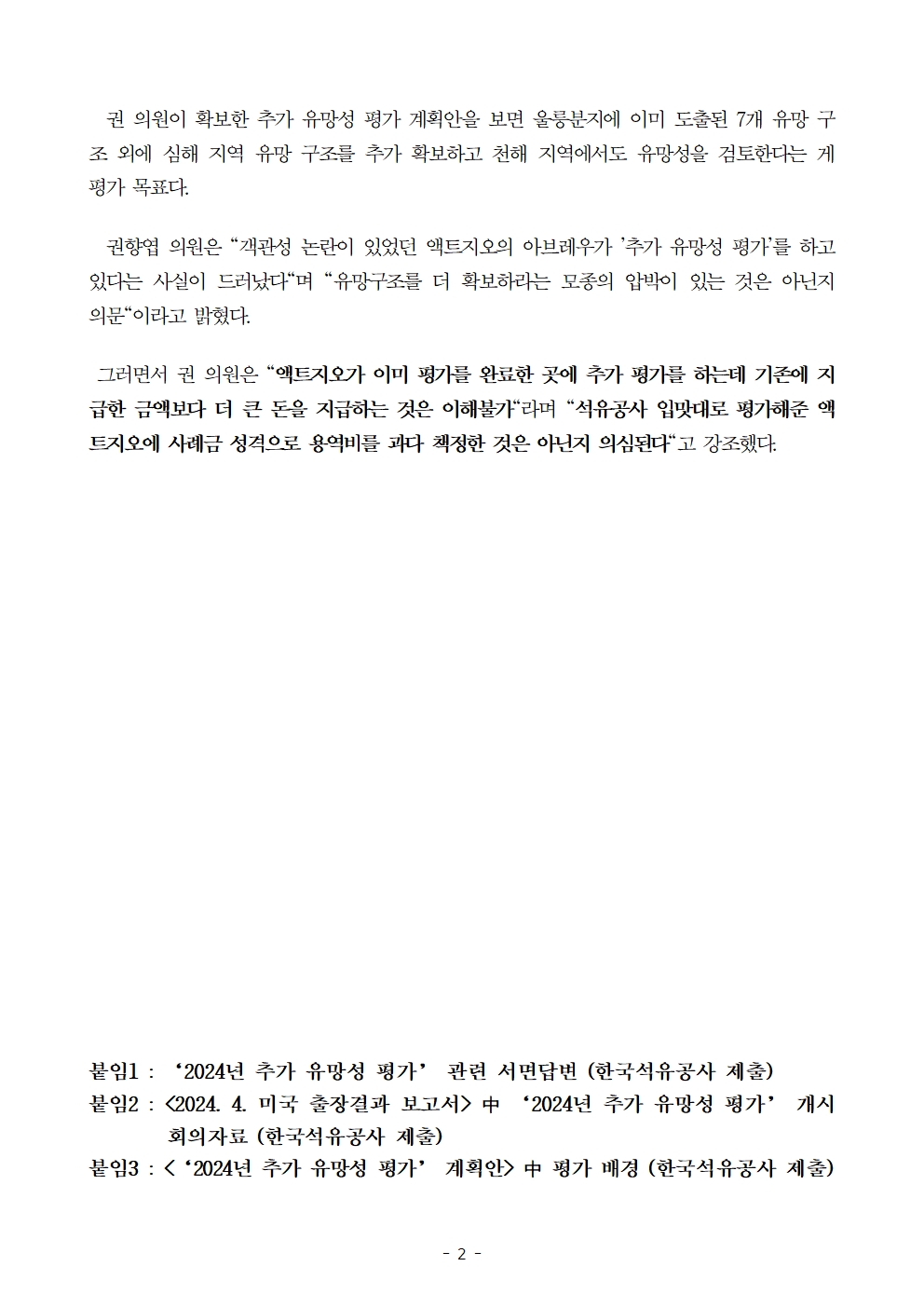 [국회의원 권향엽] 석유公, 아브레우에 170만불 더 주고 동해 추가 평가