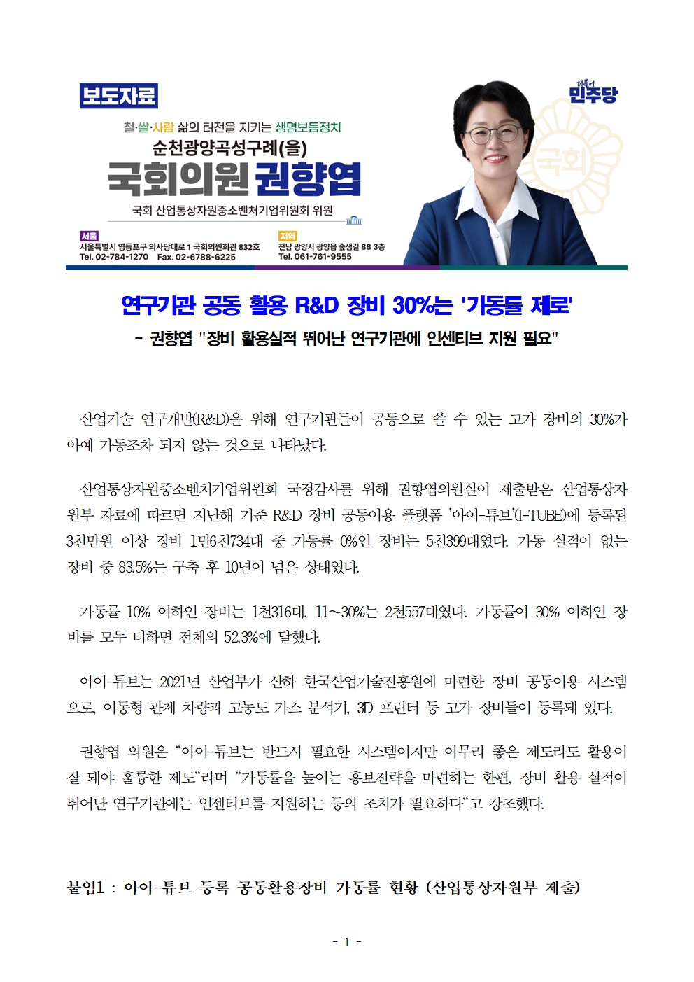[권향엽 국회의원] 241008 보도자료_연구기관 공동 활용 R&D 장비 30%는 가동률 제로.hwp