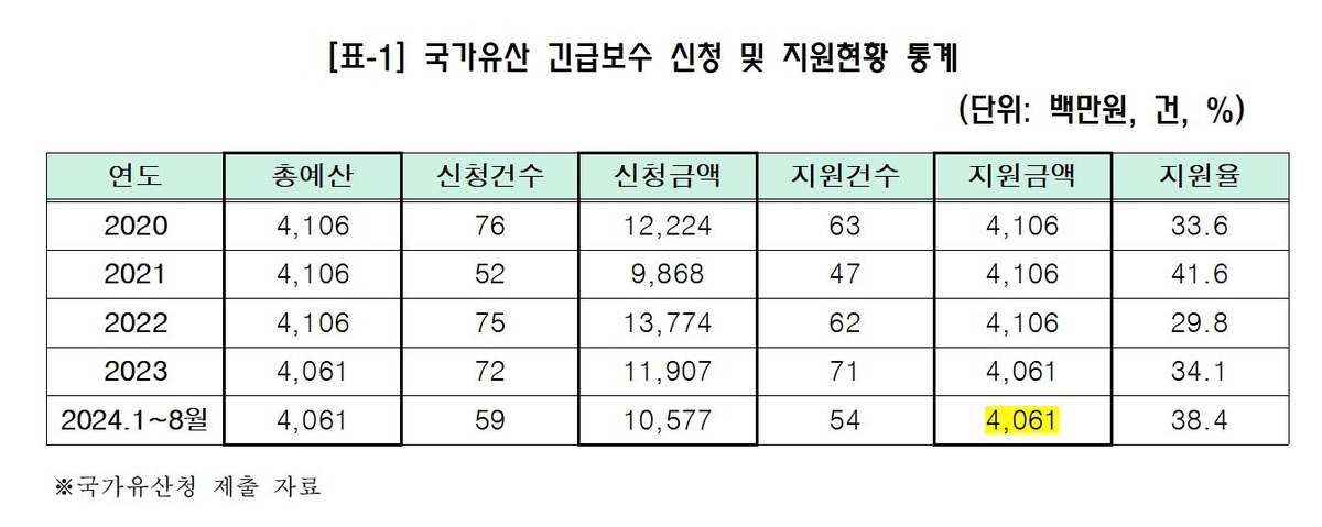 의원실 측은 "올해의 경우 가을 태풍과 겨울 대설이 예상되는 상황이지만, 9월 현재 국가유산 긴급보수비로 쓸 수 있는 예산은 모두 소진된 상황"이라고 지적했다.