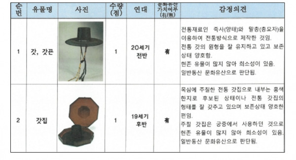 국가유산청은 감정종합의견에서 '갓' 등 일반동산 문화유산 14점은 제작된 지 50년이 지났고, 형태 및 제작방식, 구성요소 등에서 전통성을 갖추고 있으며, 역사적·예술적·학술적 가치가 있는 것으로 판단했다. 그리고 “현존유물이 많지 않아 희소성이 있다”고 밝혔다.