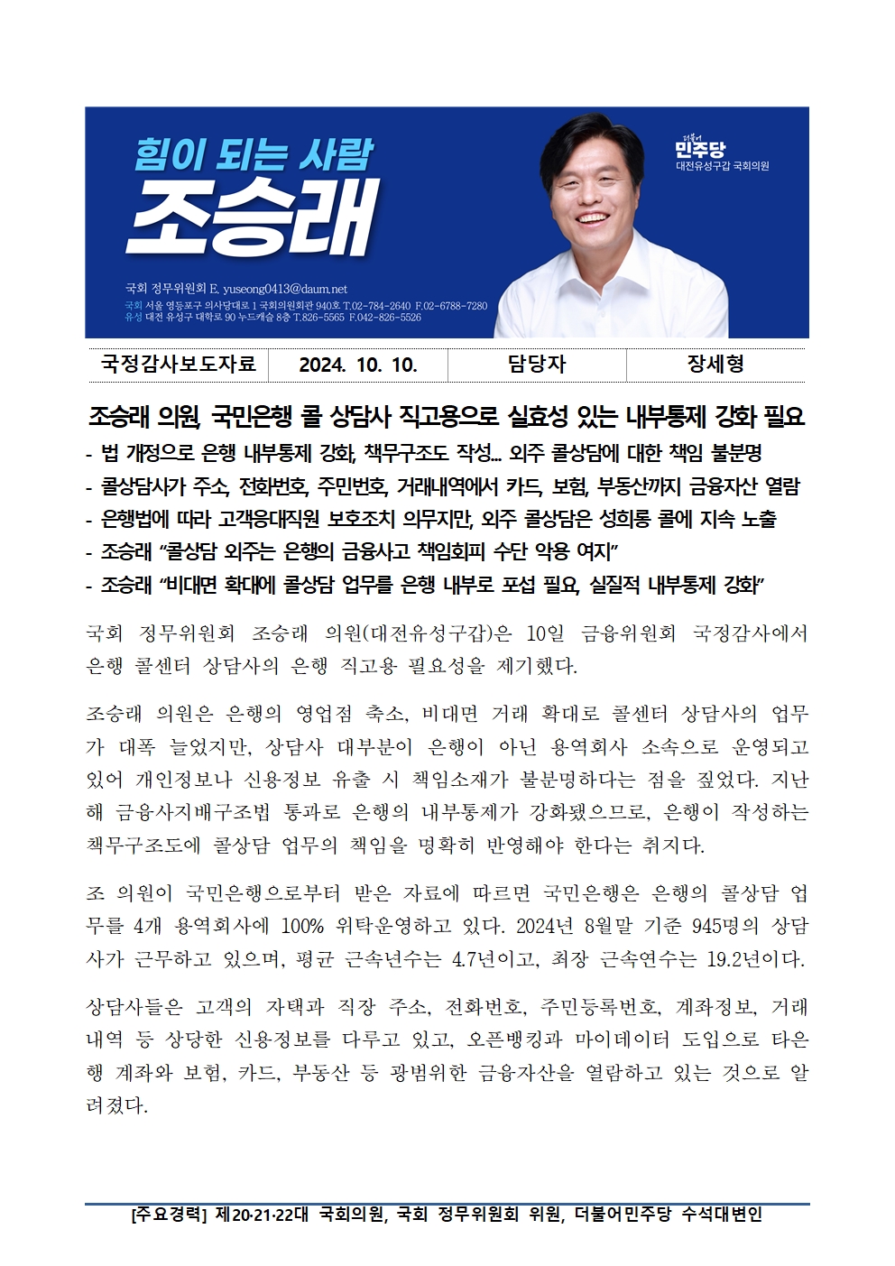 [국회의원 조승래] 조승래 의원, 국민은행 콜 상담사 직고용으로 실효성 있는 내부통제 강화 필요