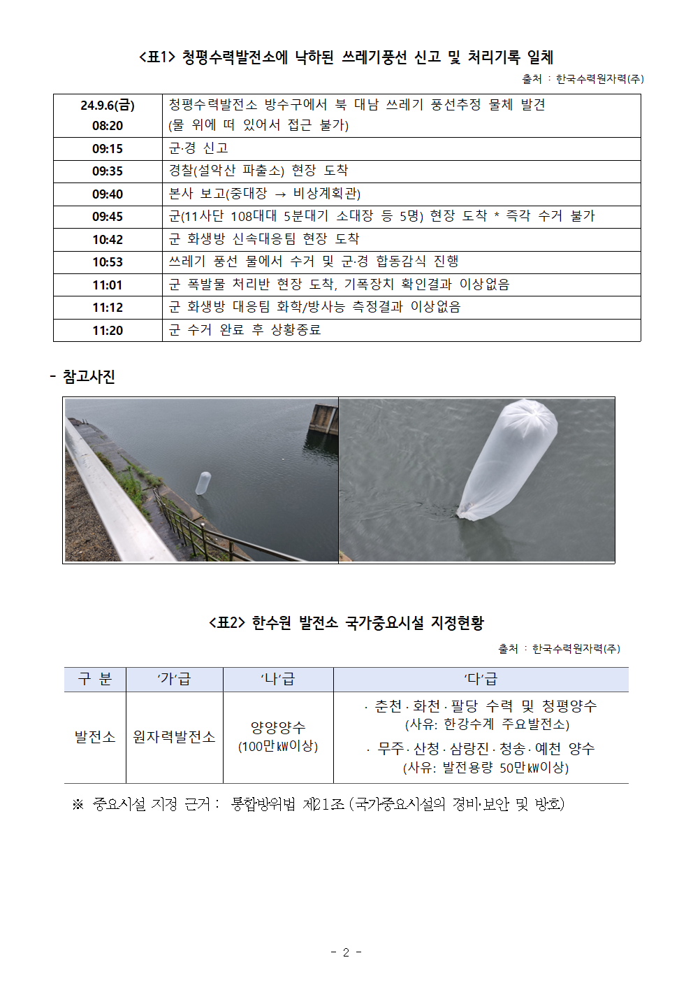 [국회의원 한민수] 한수원 청평수력발전소(댐)에도 오물 풍선 낙하 사례 발생