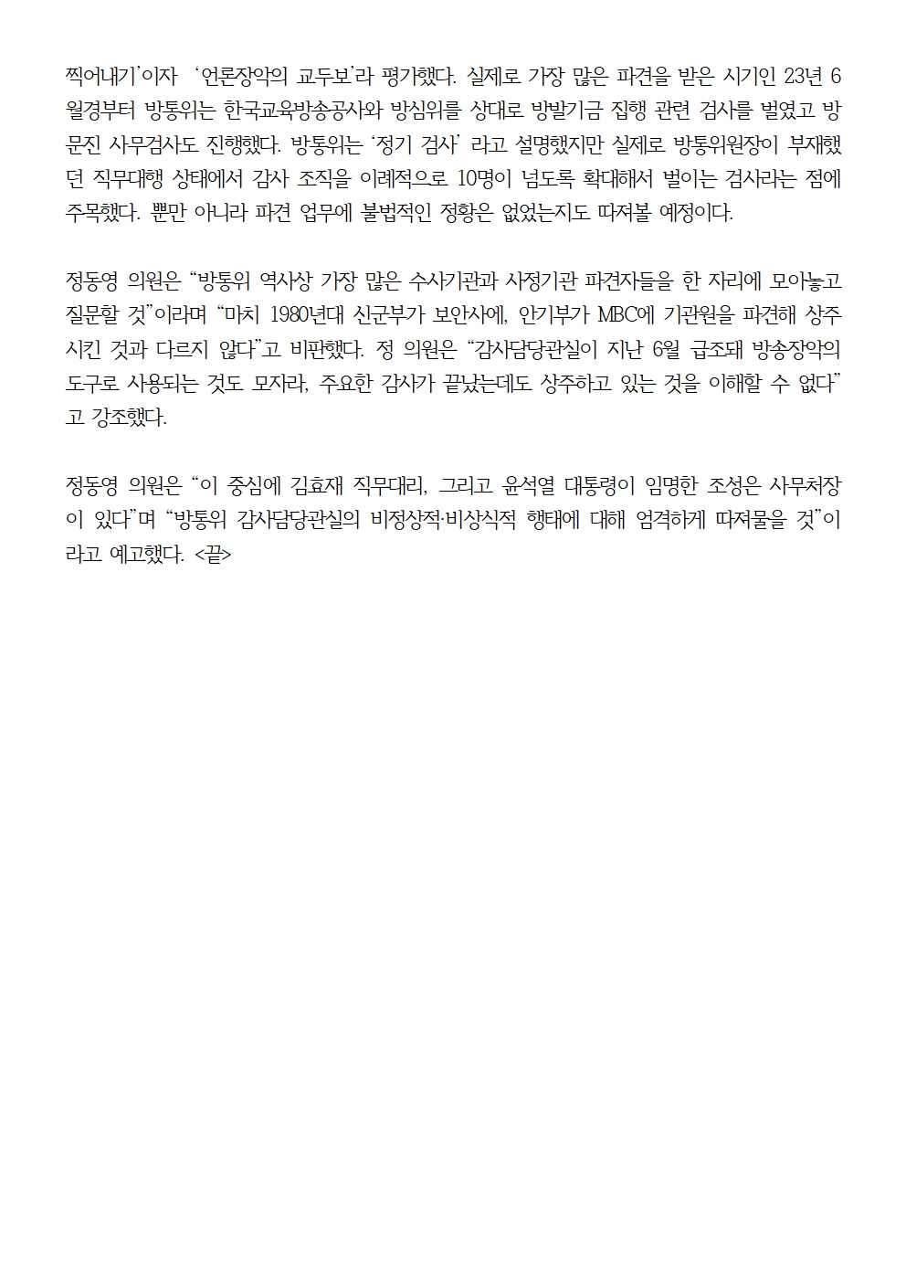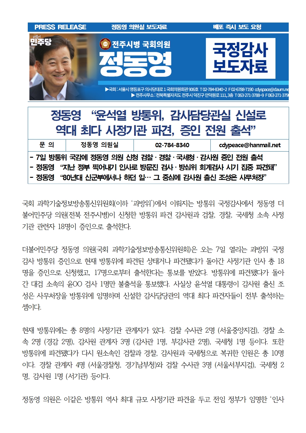 [국회의원 정동영 국감보도자료] 정동영 “윤석열 방통위, 감사담당관실 신설로 역대 최다 사정기관 파견, 증인 전원 출석”