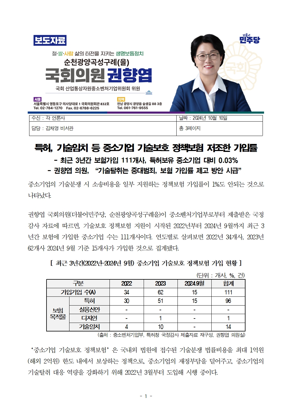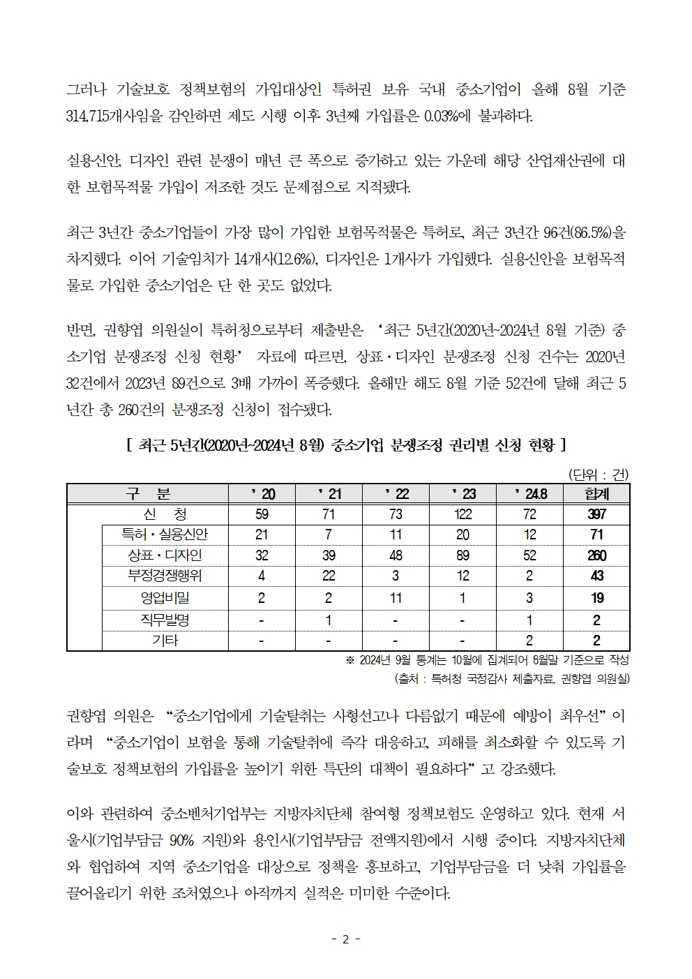 [권향엽 국회의원]_241010_특허 기술임치 등 중소기업 기술보호 정책보험 저조한 가입률.hwp