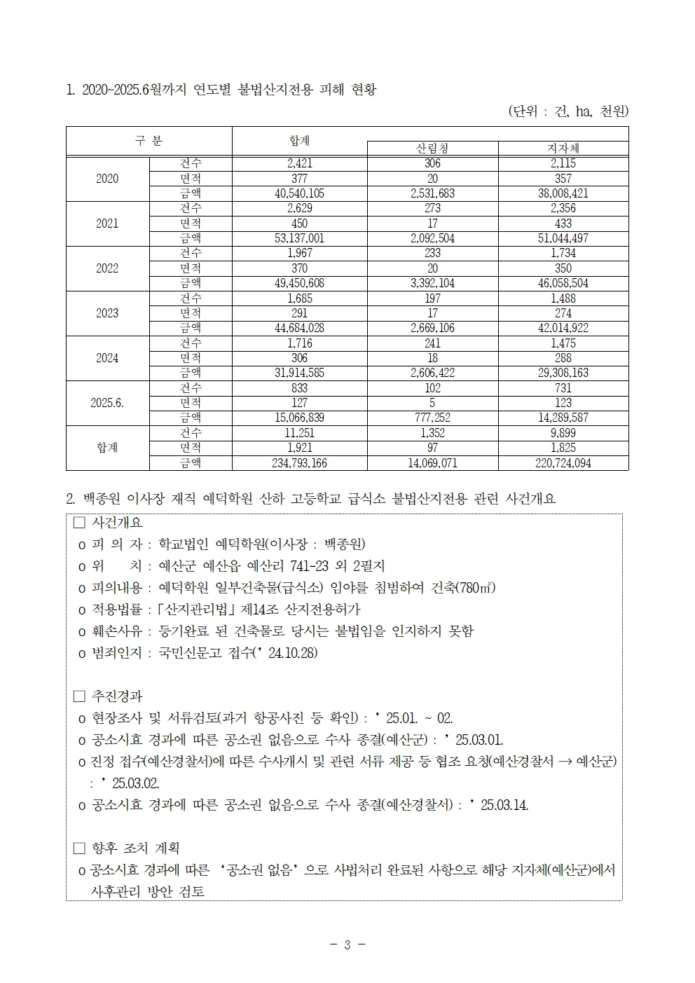 [윤준병 의원 국정감사 보도자료] 불법산지전용 공소시효 만료로 처벌 피한 ‘제2의 백종원·예덕학원’ 수두룩