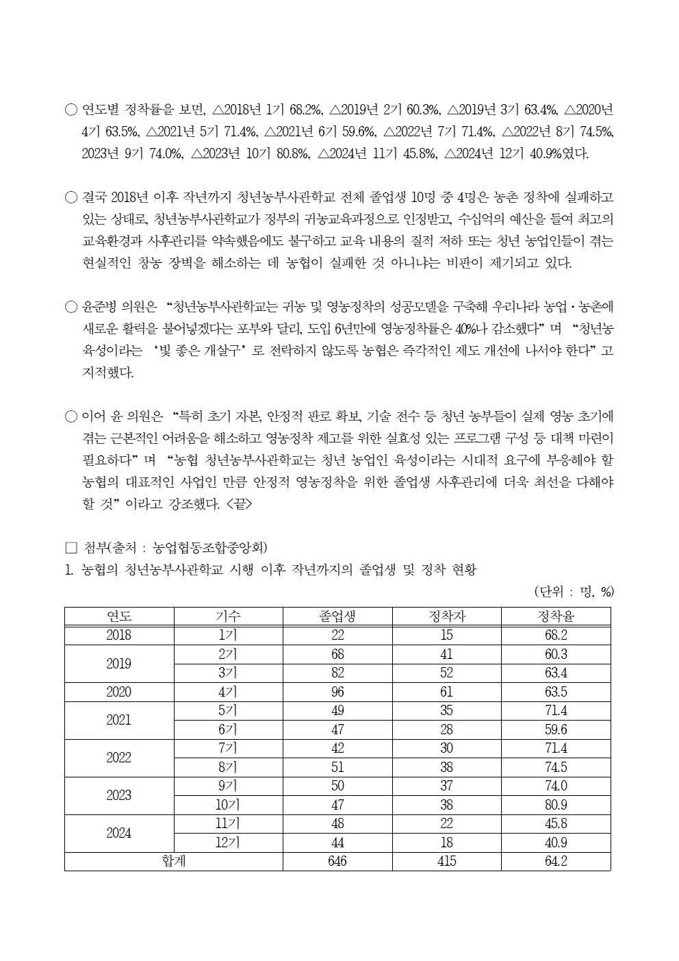 [윤준병 의원 국정감사 보도자료] 농협 청년농부사관학교 작년 영농정착률 40% 폭락, 청년농 육성 무색