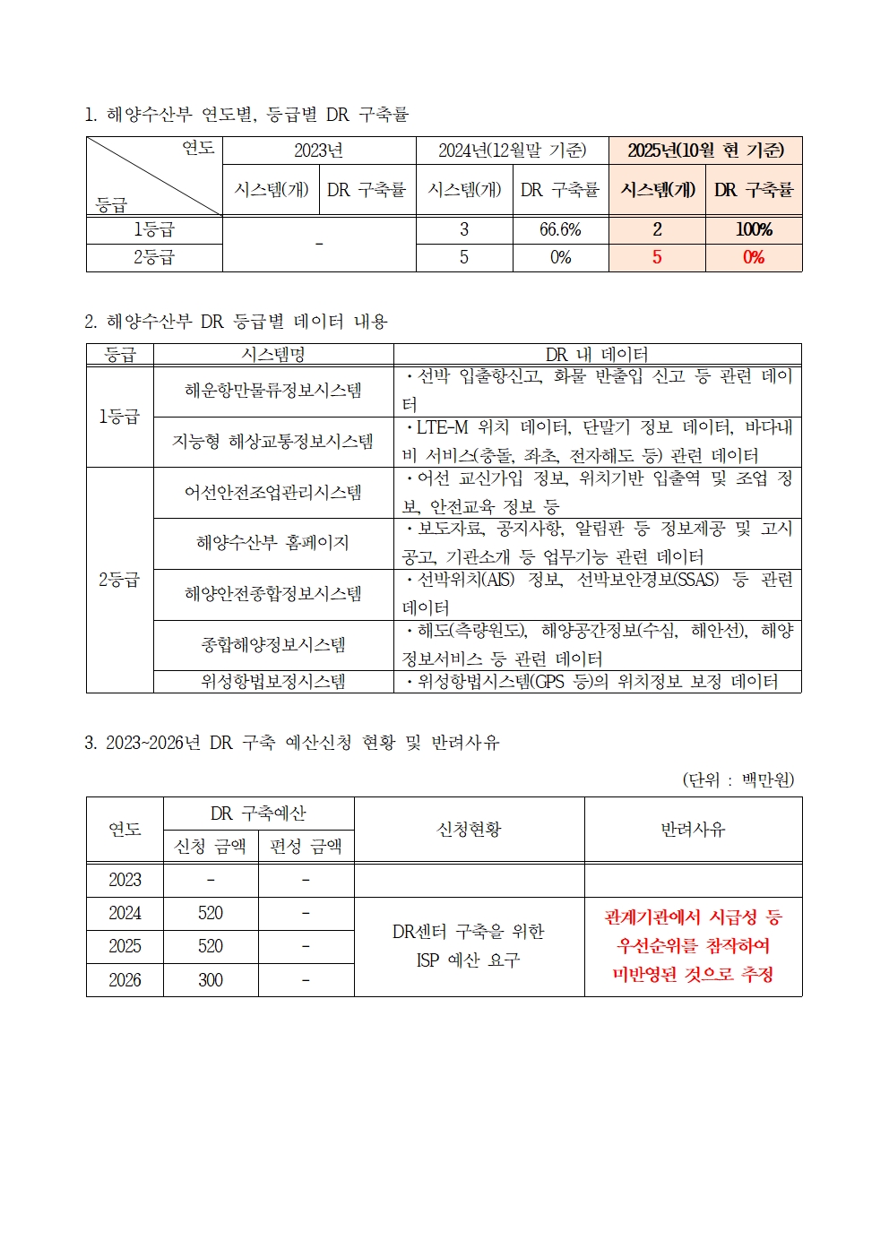 [윤준병 의원 국정감사 보도자료] 해양수산부, 중요성 높은 1·2등급 재해복구시스템 구축률 30% 밑돌아!