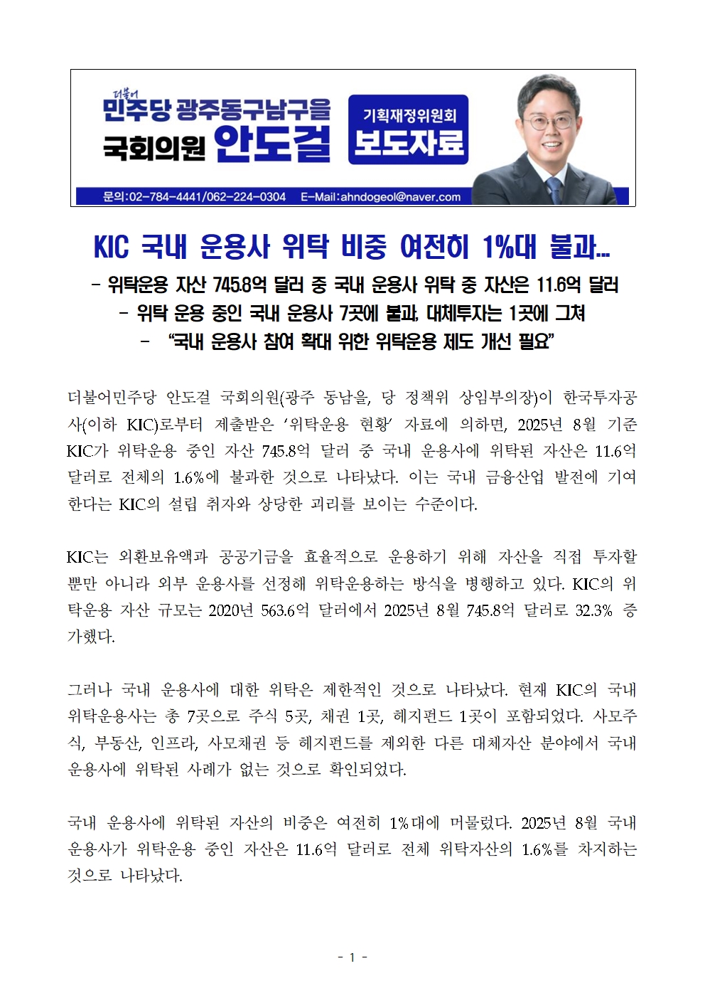 [국회의원 안도걸 보도자료] KIC 국내 운용사 위탁 비중 여전히 1%대 불과...